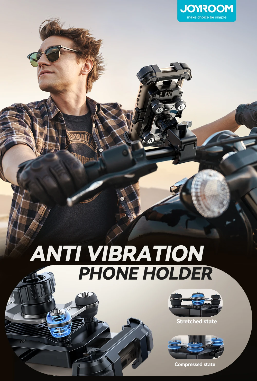 ¡Conquista senderos con baches con sistemas de amortiguación de grado militar!Los módulos antivibraciones absorben el 80% de los descargas en la carretera, manteniendo su teléfono estable incluso en aventuras todoterreno.Di adiós a las pantallas de navegación borrosas.