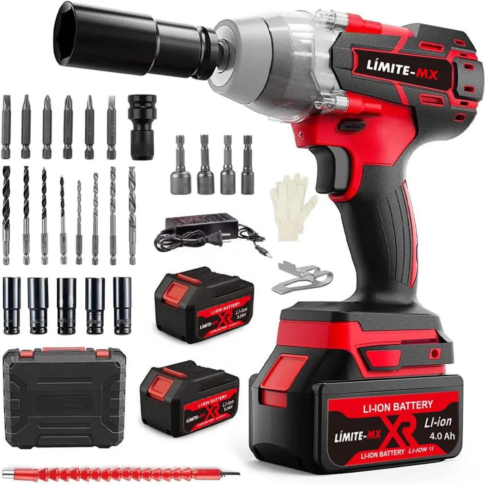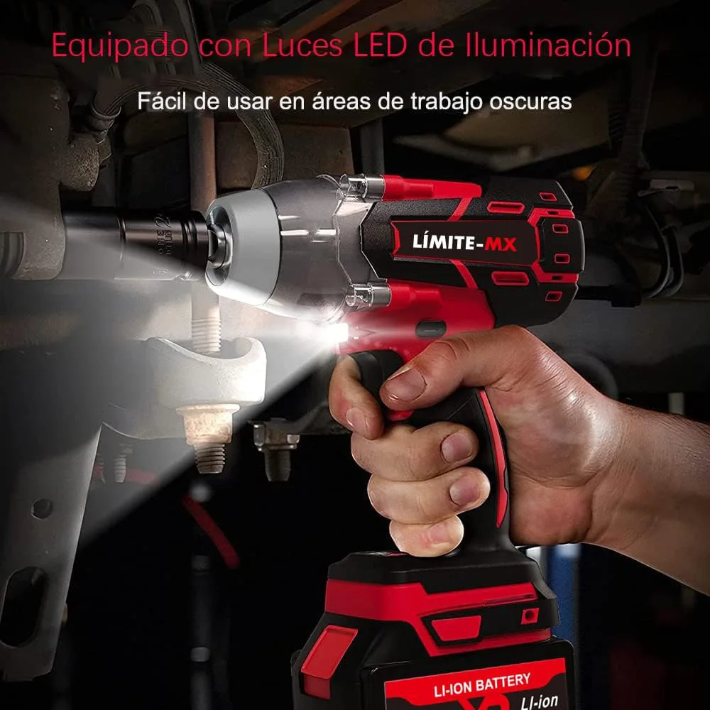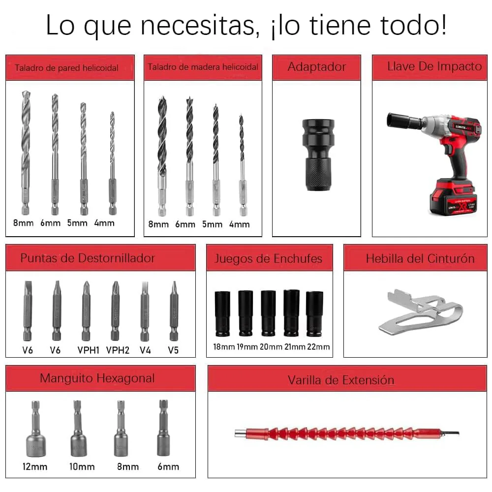 El kit incluye llave de impacto, 2 baterías 4,0 AH con cargador rápido, 6 casquillos de impacto (14/17/18/19/21/22 mm), 9 taladros de impacto, 6 tornillos de impacto y 1 caja.