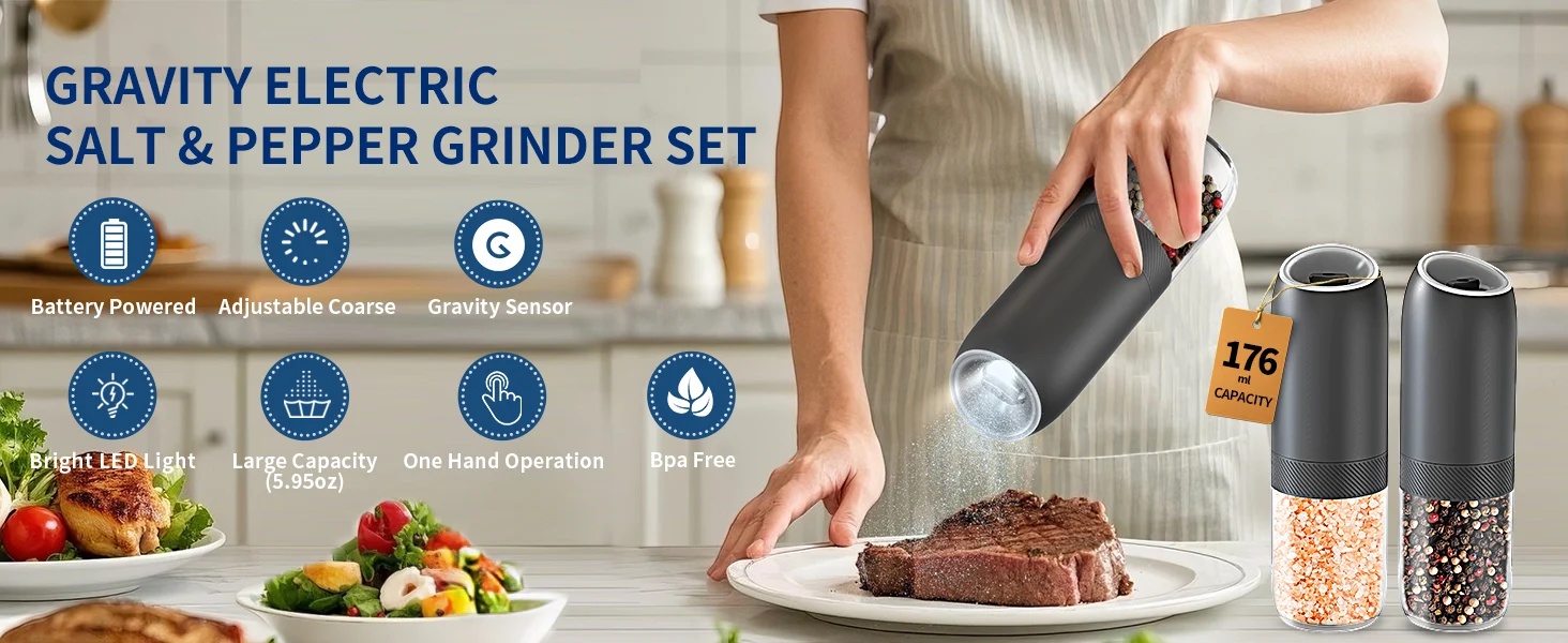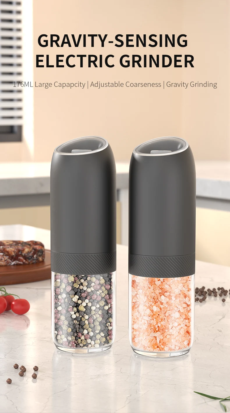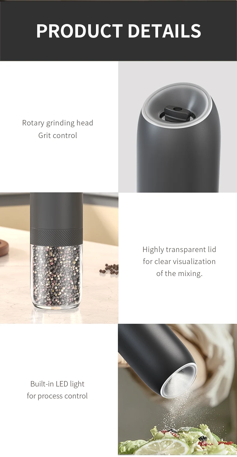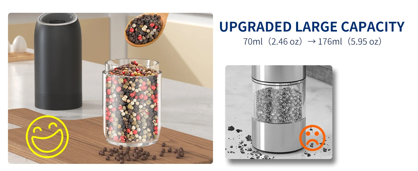 【Gran capacidad mejorada de 176 ml】El molinillo de pimienta eléctrico por gravedad contiene 176 ml (6 oz) de especias para reducir los recambios frecuentes.La tolva acrílica transparente y sin BPA le permite controlar fácilmente los niveles de especias, mientras que el diseño de boca ancha simplifica el llenado.Además, el recipiente se puede lavar a mano.
