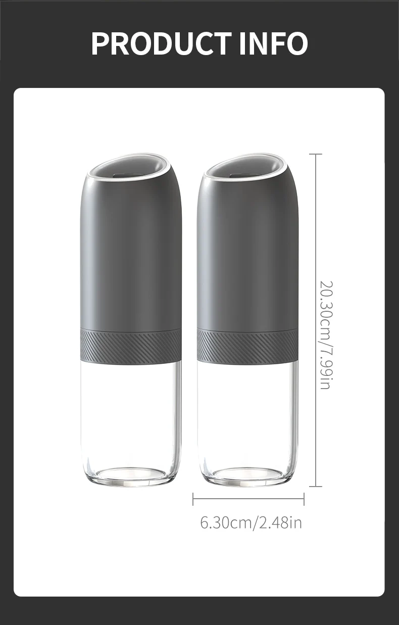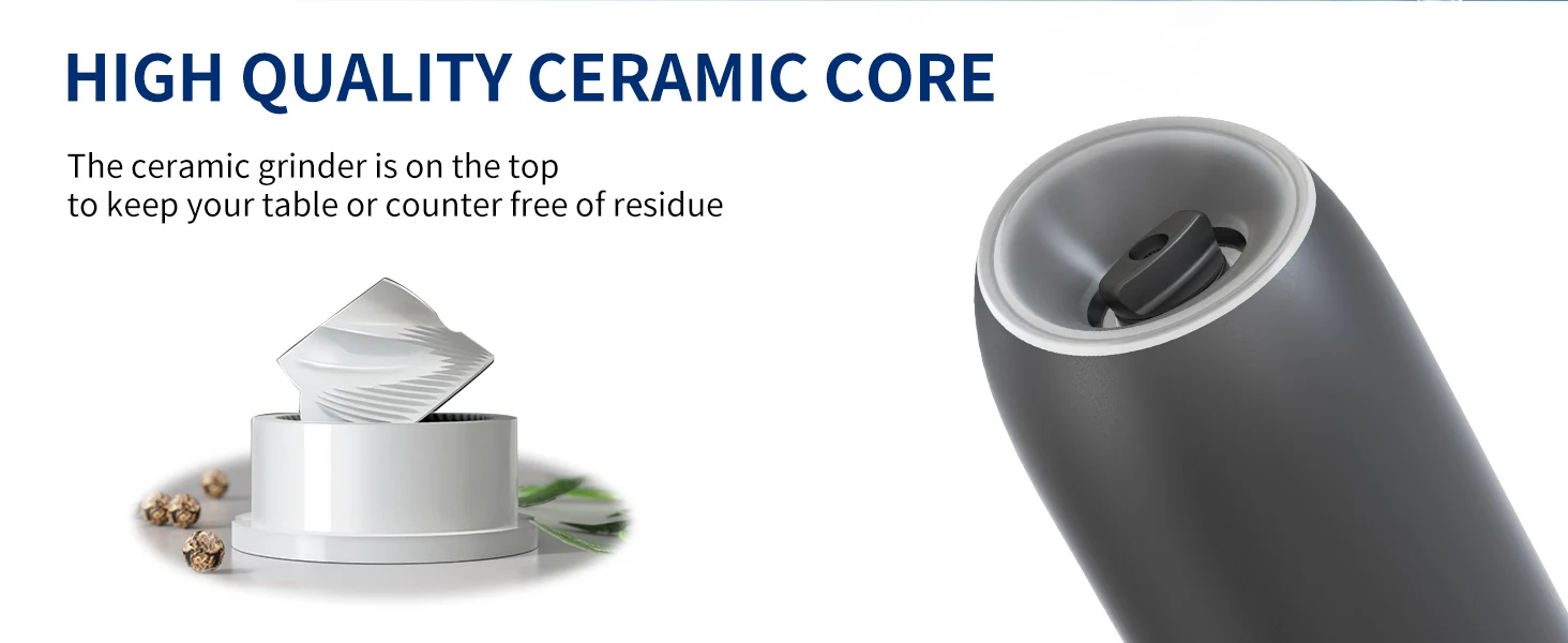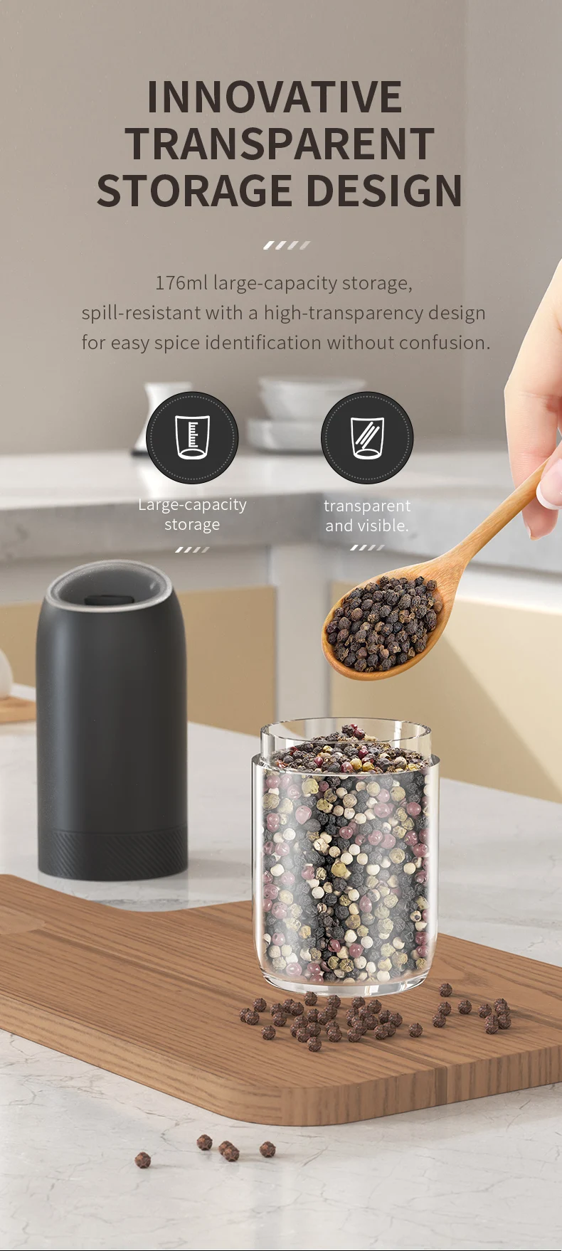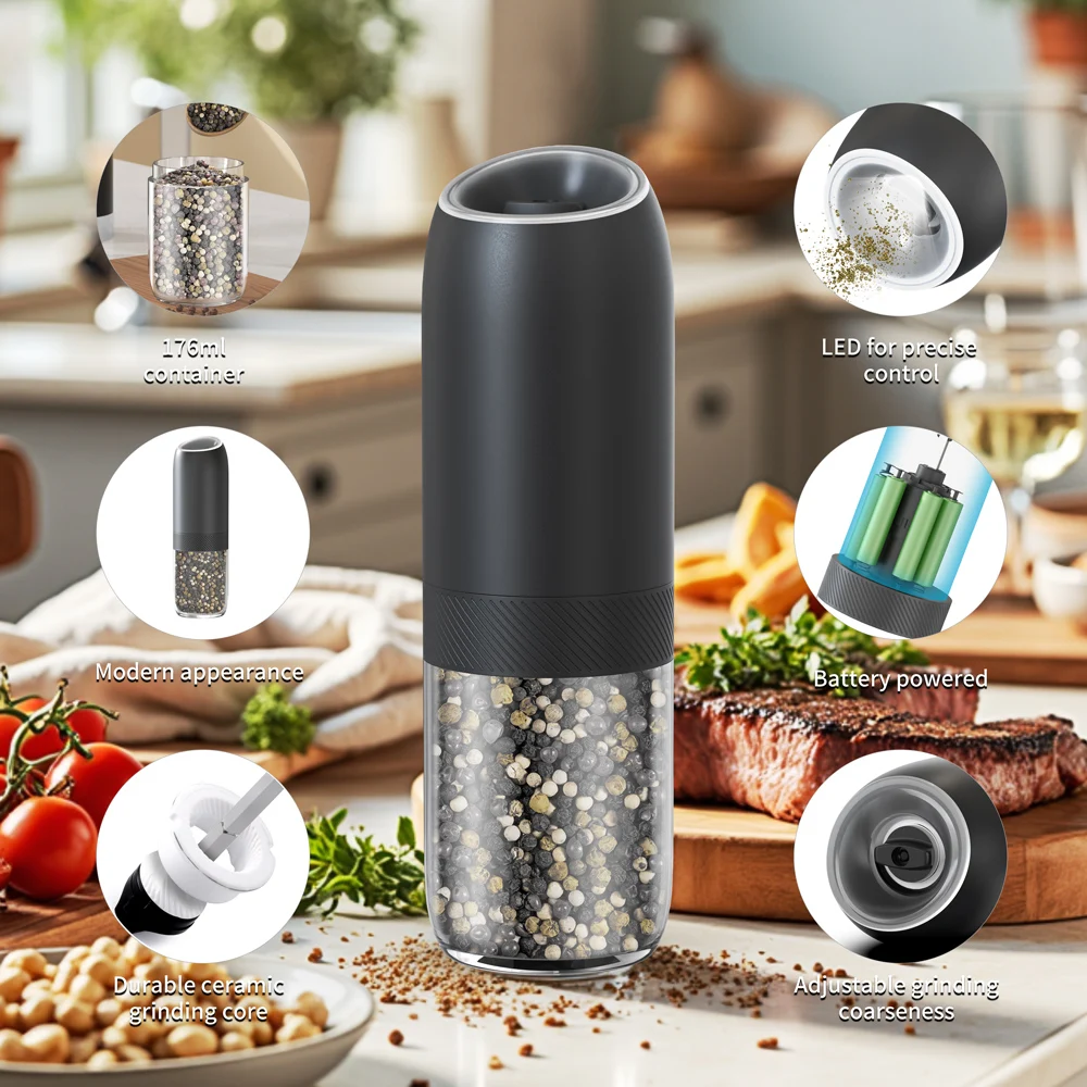 【Gran capacidad mejorada de 176 ml】El molinillo de pimienta eléctrico por gravedad contiene 176 ml (6 oz) de especias para reducir los recambios frecuentes.La tolva acrílica transparente y sin BPA le permite controlar fácilmente los niveles de especias, mientras que el diseño de boca ancha simplifica el llenado.Además, el recipiente se puede lavar a mano.