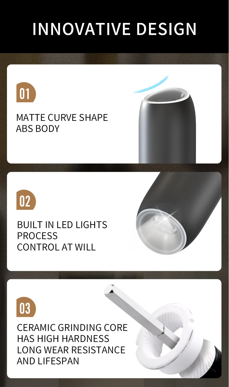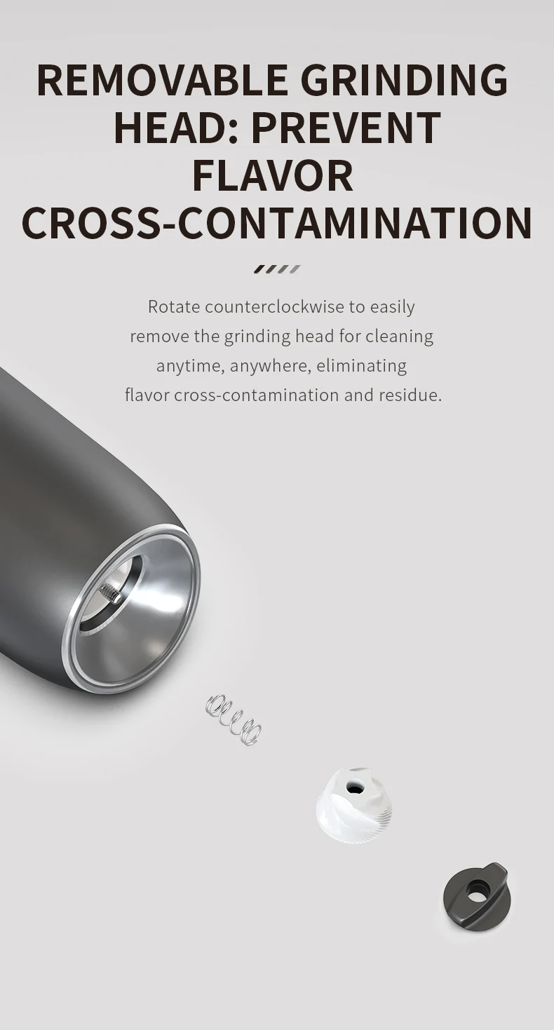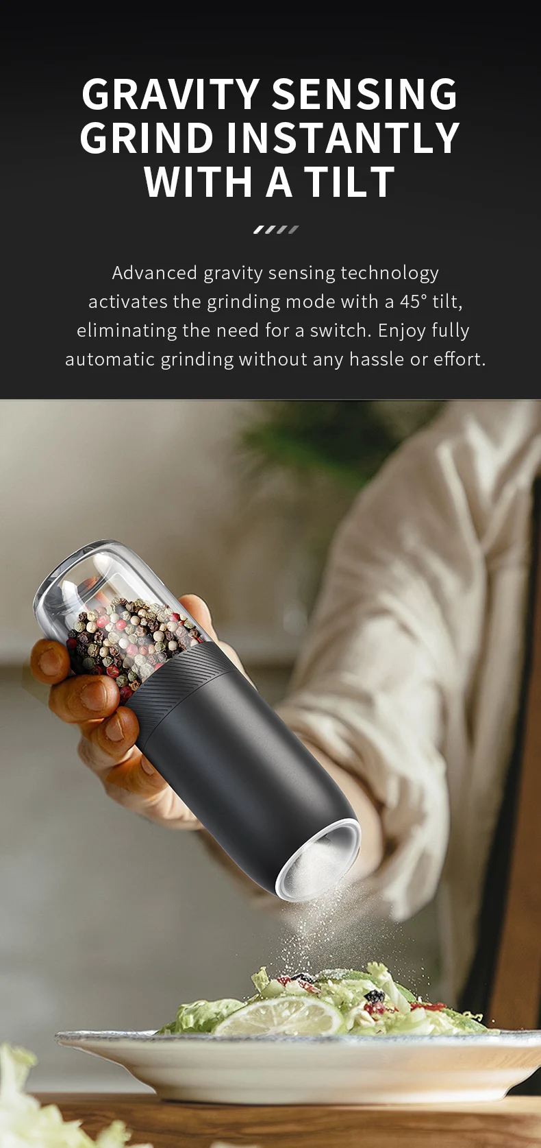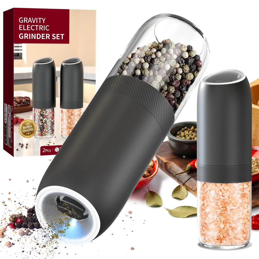 【Gran capacidad mejorada de 176 ml】El molinillo de pimienta eléctrico por gravedad contiene 176 ml (6 oz) de especias para reducir los recambios frecuentes.La tolva acrílica transparente y sin BPA le permite controlar fácilmente los niveles de especias, mientras que el diseño de boca ancha simplifica el llenado.Además, el recipiente se puede lavar a mano.