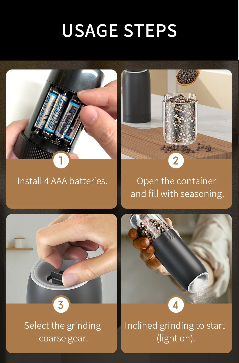 【Juego de sal y pimienta mejorado】El juego de molinillo automático de sal y pimienta mejorado tiene una larga vida útil y es más asequible ya que solo requiere 4 pilas AAA (no incluidas), mientras que otros productos requieren 6 pilas AAA.