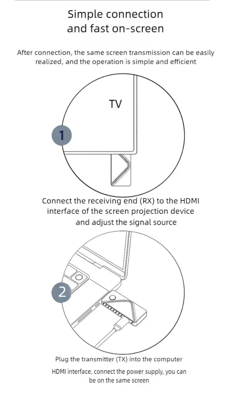 El transmisor inalámbrico HDMI transmite señales de audio y video de alta definición a través de WiFi 5G, y los vídeos de alta definición desde PC o dispositivos móviles completamente funcionales se transmiten a través de WiFi, lo que permite aplicaciones uno a uno.El dispositivo tiene excelentes capacidades de transmisión y procesamiento de imágenes, lo que hace que la transmisión de la señal sea más fluida y estable.Principales características
