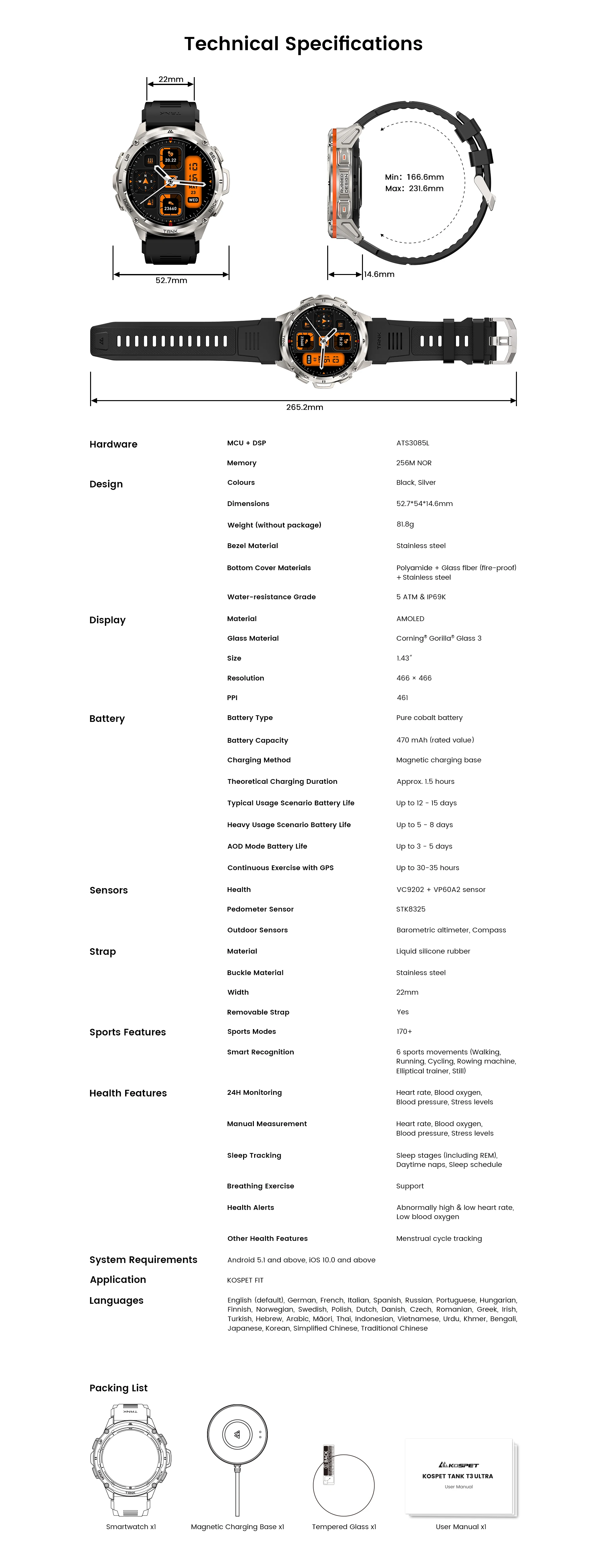 KOSPET-reloj inteligente T3 para hombre y mujer, Pulsera Original con GPS, Bluetooth, AMOLED, AOD, 470mAh