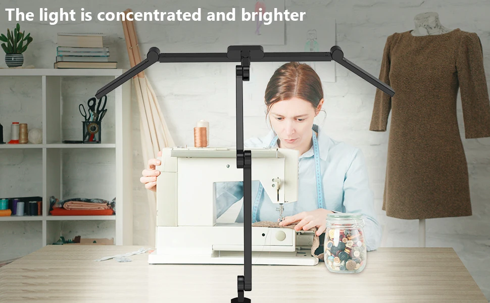 Cuando necesite enfocar la luz en la costura, el dibujo o la artesanía, puede girar las barras de luz bilaterales hacia abajo para crear un área de iluminación súper brillante. O puede girar una barra de luz hacia abajo para eliminar sombras.