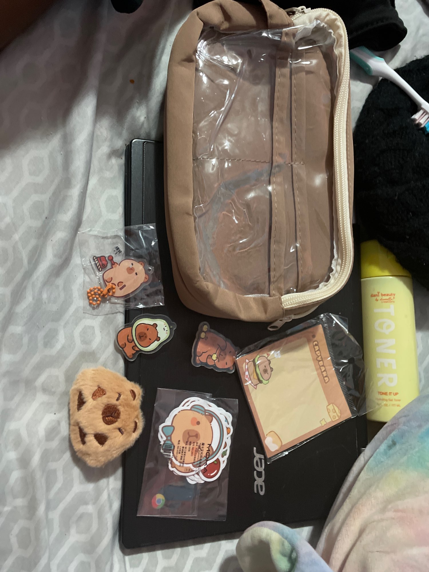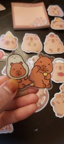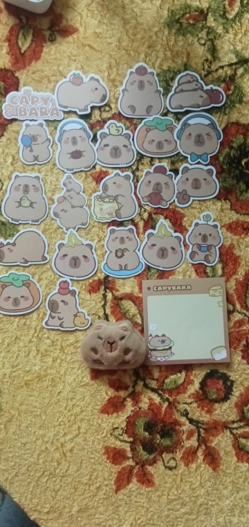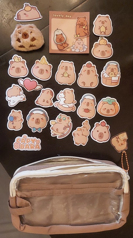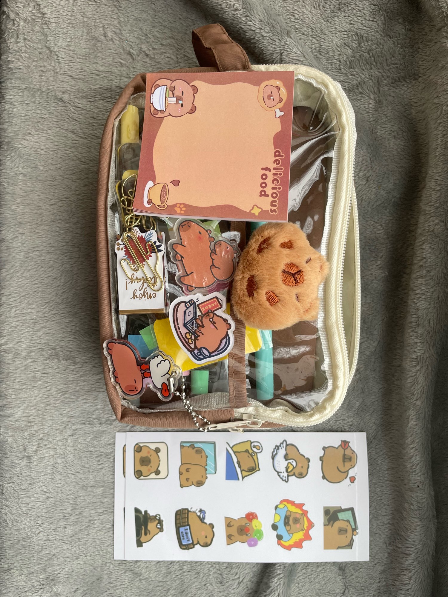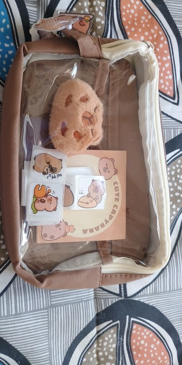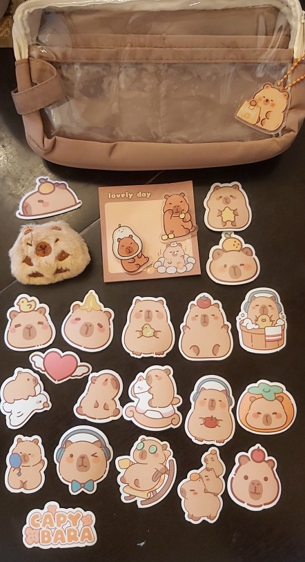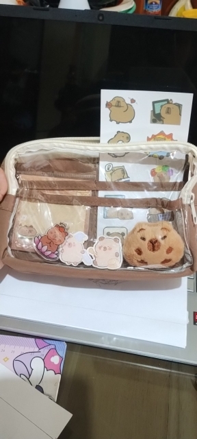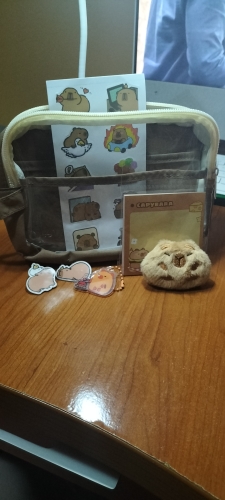 ¡Envío rapidísimo! Producto de buena calidad. Bonito estuche con 1 llavero de Carpincho incluido, ¡con espacio de sobra para guardar artículos de papelería! Recibí un bloc de notas, 20 adorables pegatinas de carpinchos, 2 encantadores pines de plástico y 1 pin suave y peludo de carpincho. ¡Gracias por ofrecer este artículo como parte de la promoción para nuevos miembros! !