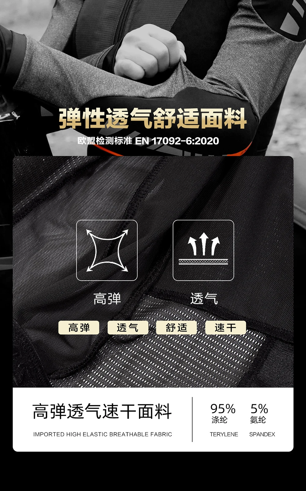 Características del producto: tejido de alta elasticidad, absorción de humedad y ventilación, alto reflejo por la noche.
