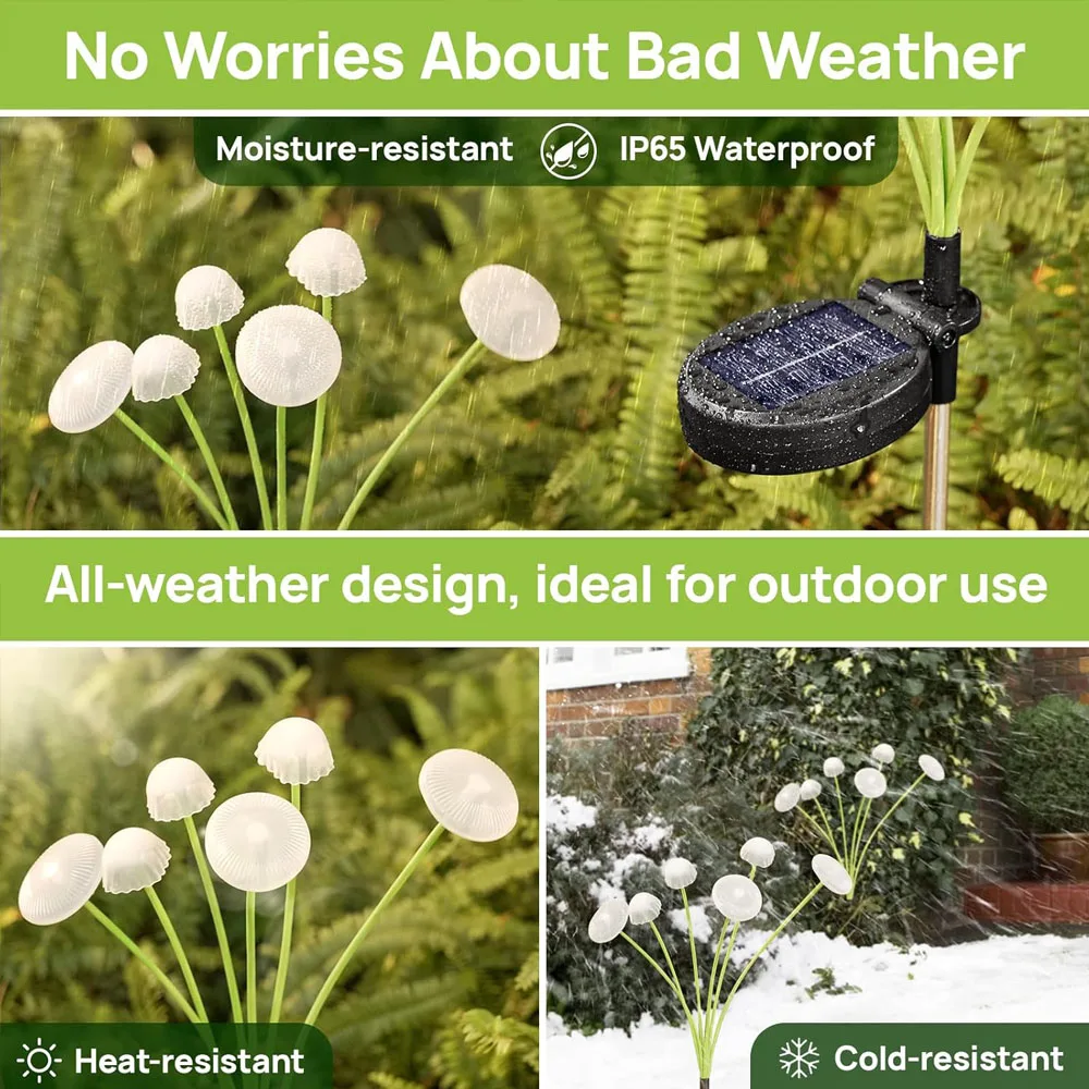 Resistente a la intemperie y duradera: la luz solar impermeable para exteriores está diseñada para soportar todas las condiciones climáticas (lluvia, nieve o calor), para que pueda disfrutar de una hermosa iluminación en su jardín durante todo el año sin preocupaciones.