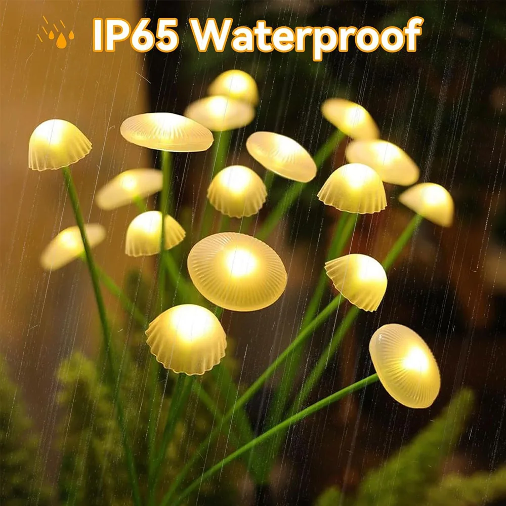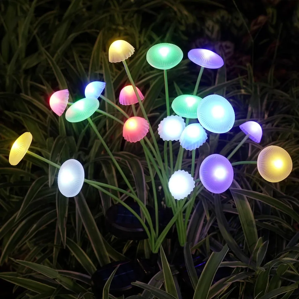 Forma decorativa de hongo: estas luces solares en forma de hongo proyectan un brillo cálido y acogedor que transforma patios, caminos y áreas de jardín en espacios mágicos y relajantes para reuniones familiares o veladas tranquilas al aire libre.