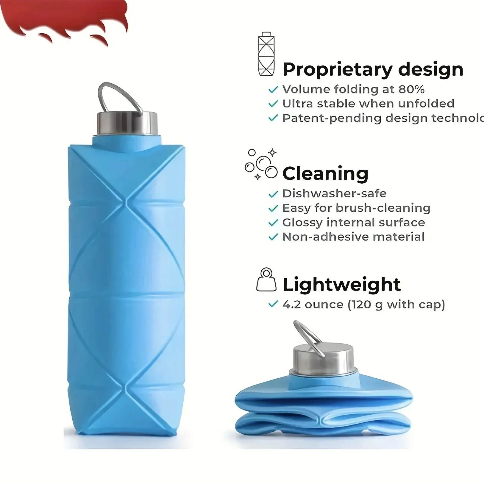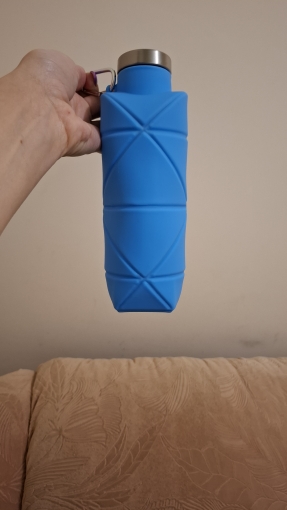 ¡Excelente botella! No tiene ningún olor a goma. Es ligera y se pliega rápidamente. Cabe en cualquier bolso.
