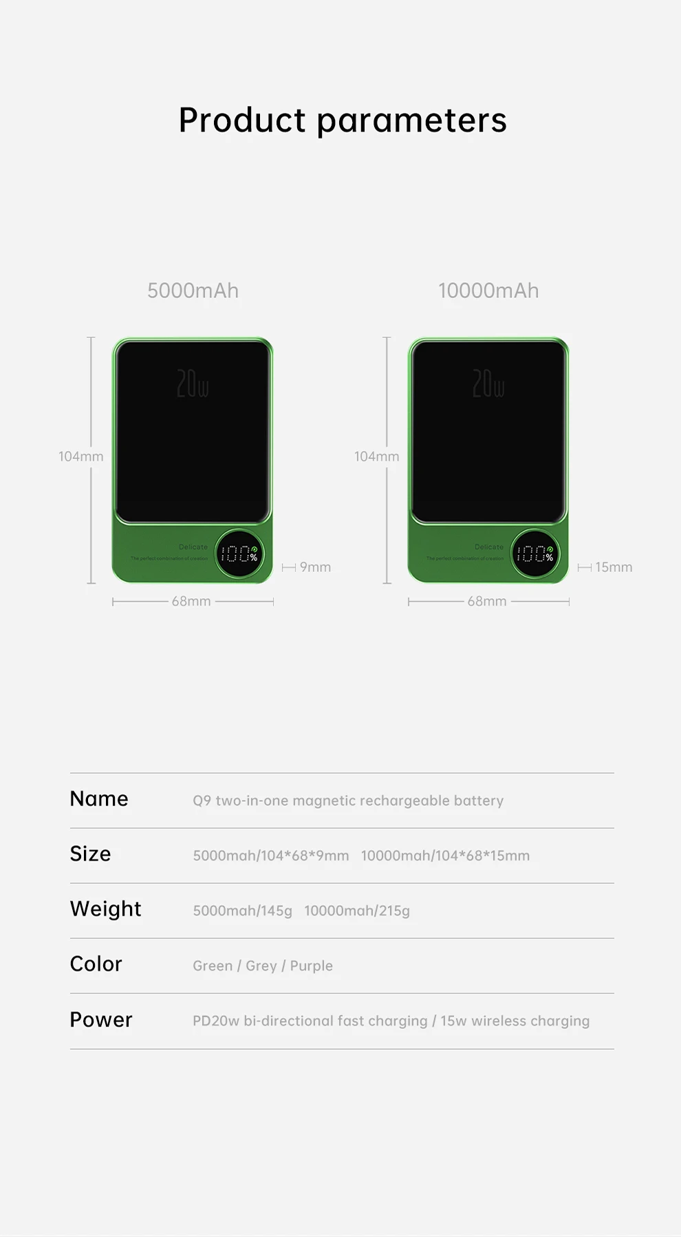 Especificación: 5000mAh(104*68*9mm 145g) 10000mAh(104*68*15mm 215g)