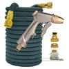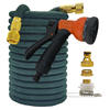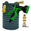 Descripción: Esta manguera de jardín está hecha de un material flexible, por lo que es extremadamente fácil de usar y satisface sus necesidades. El material ligero lo hace maniobrable y fácil de almacenar una vez que haya terminado con él. El diseño único de esta manguera evita que se tuerza, se retuerza y se enrede. Esta práctica manguera de jardín es increíblemente ligera, flexible y fácil de usar. Comienza a 2,5 m y se expande a 7,5 m con la presión del agua, pero vuelve en segundos a 2,5 m después de que el agua está fuera.