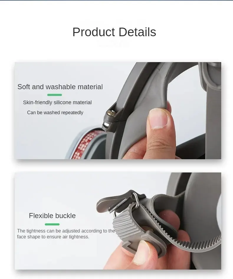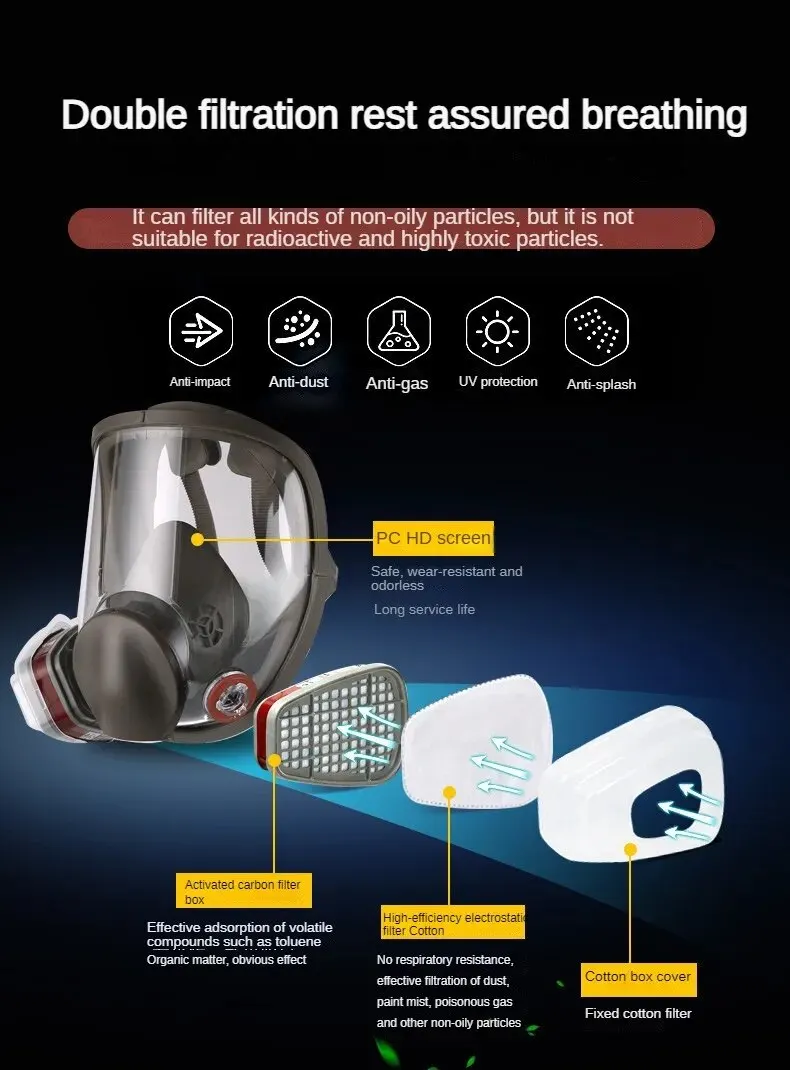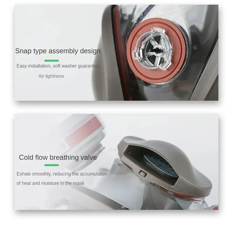 • Diseño de cara completa:El diseño integral ofrece una protección integral, protegiendo los ojos, la cara y los pulmones de sustancias nocivas.