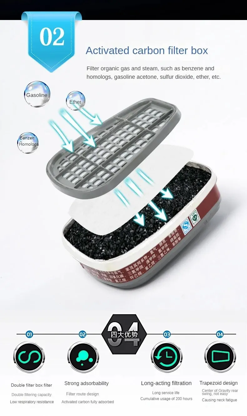 4. Durante el uso, cuando el usuario huele el olor o la resistencia a la inhalación aumenta, la vida útil de la caja del filtro ha llegado, reemplace la caja del filtro o el filtro de algodón inmediatamente.