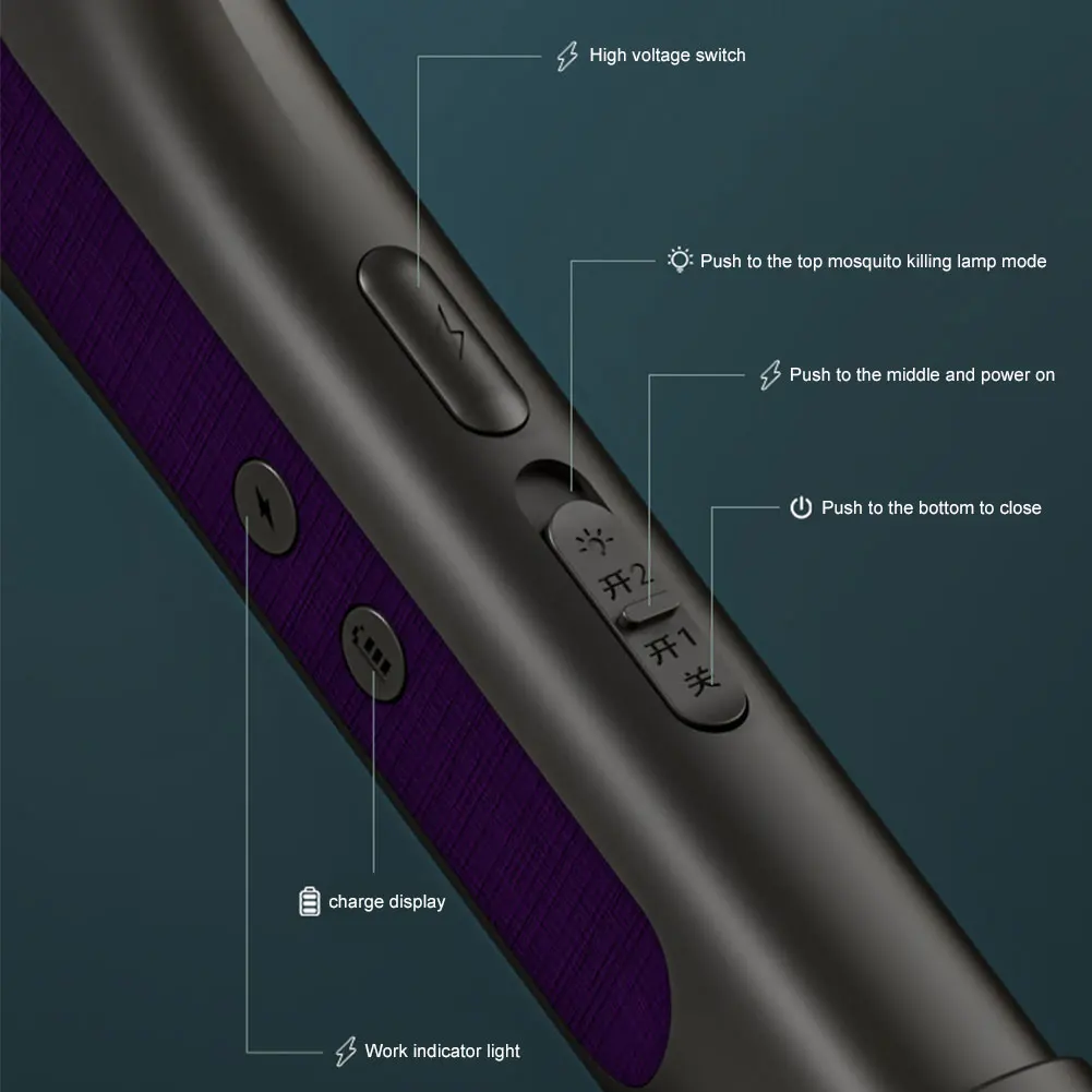 Raqueta exterminadora de insectos 2 en 1, matamoscas eléctrica recargable, matamoscas y lámpara trampa para mosquitos para el hogar, interior y exterior Características: 1.Cabezal giratorio innovador:El diseño del cabezal giratorio de nuestro matamoscas eléctrico permite capturar fácilmente insectos desde varios ángulos y superficies, incluidas las paredes.También puedes bloquear la cabeza y balancearla en el aire para atrapar insectos voladores, como un matamoscas tradicional.