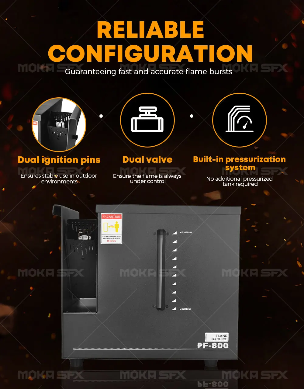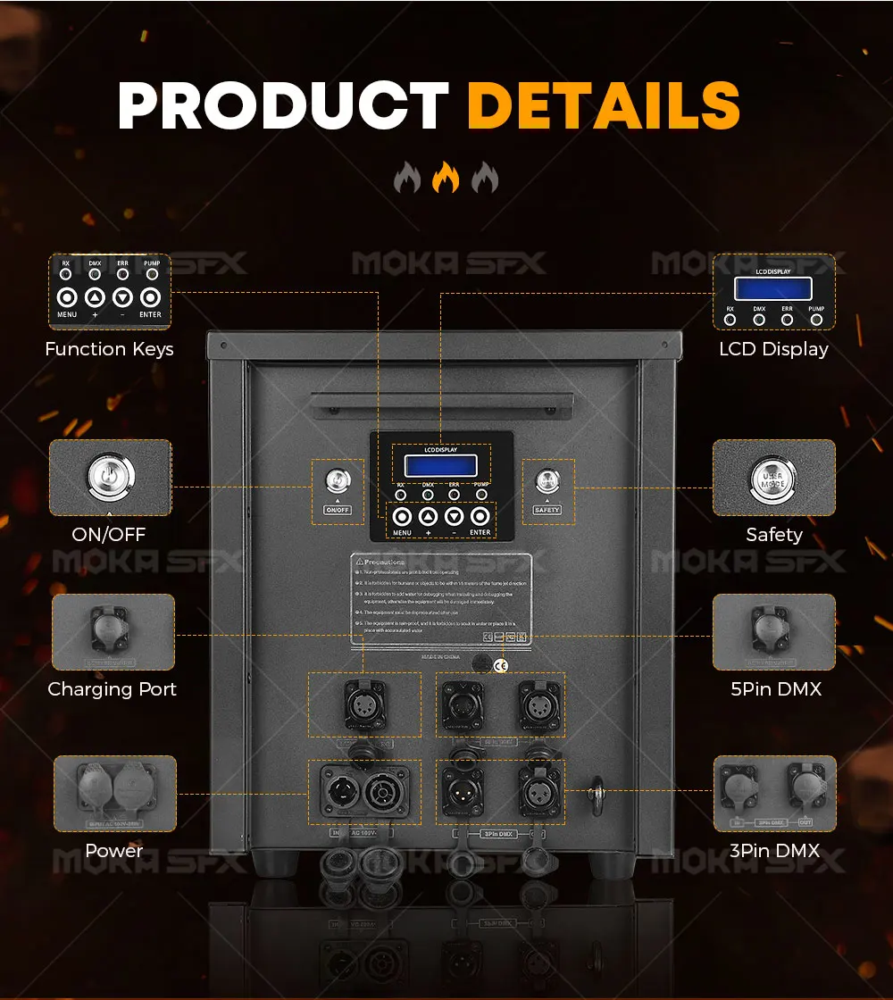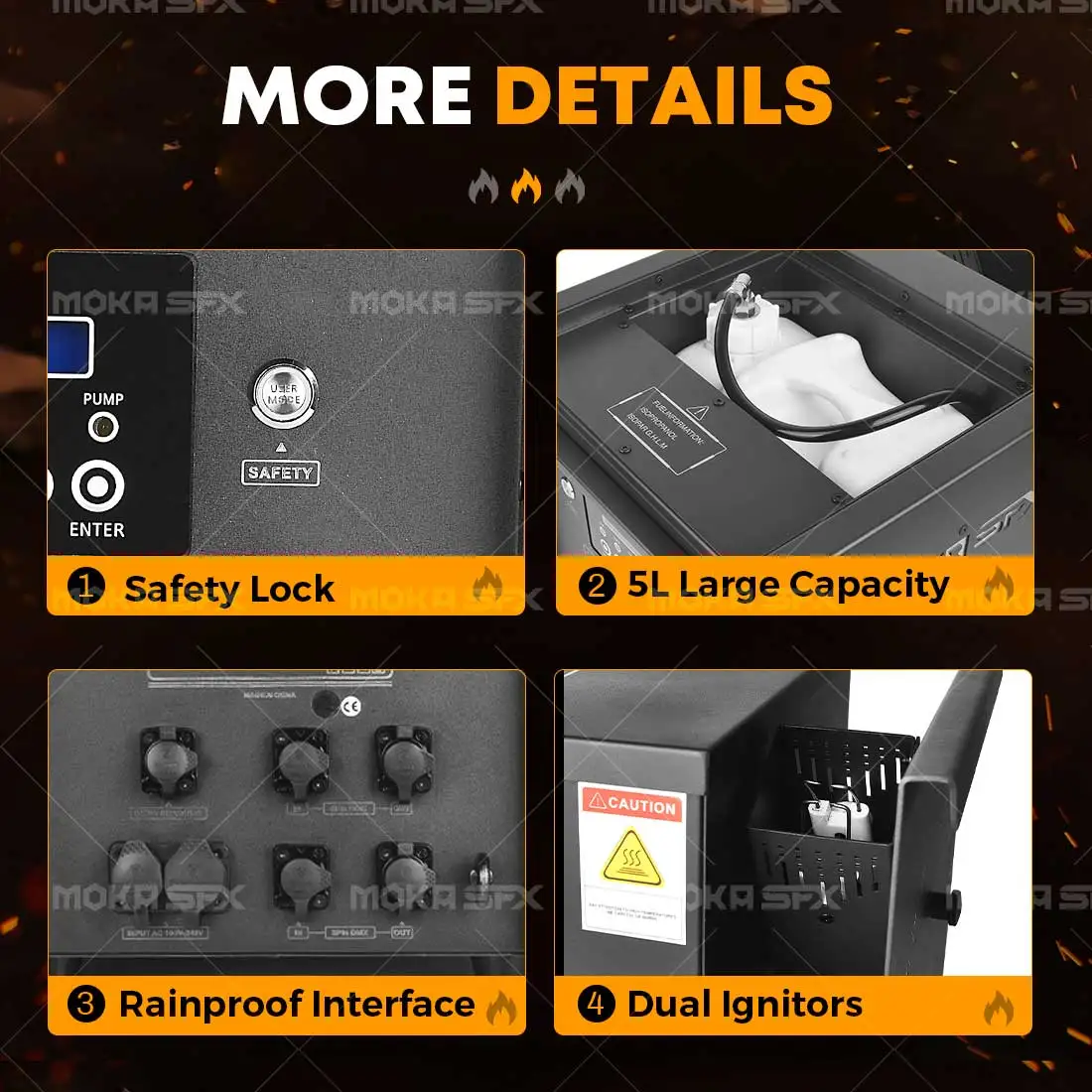 ¿Cómo garantizar la seguridad al usar SYCN FLAMER en el escenario? MOKA SYCN FLAMER utiliza tecnología y diseño avanzados, la máquina de llama está equipada con múltiples medidas de protección, como bloqueo de seguridad, sensores de temperatura y sistemas de monitoreo de presión, para garantizar que el chorro de llama esté siempre controlado. Además, nuestras máquinas de llama han pasado varias pruebas de seguridad para cumplir con los estándares de la industria, y también le proporcionamos instrucciones de funcionamiento detalladas para garantizar que pueda utilizar estas máquinas de forma segura.