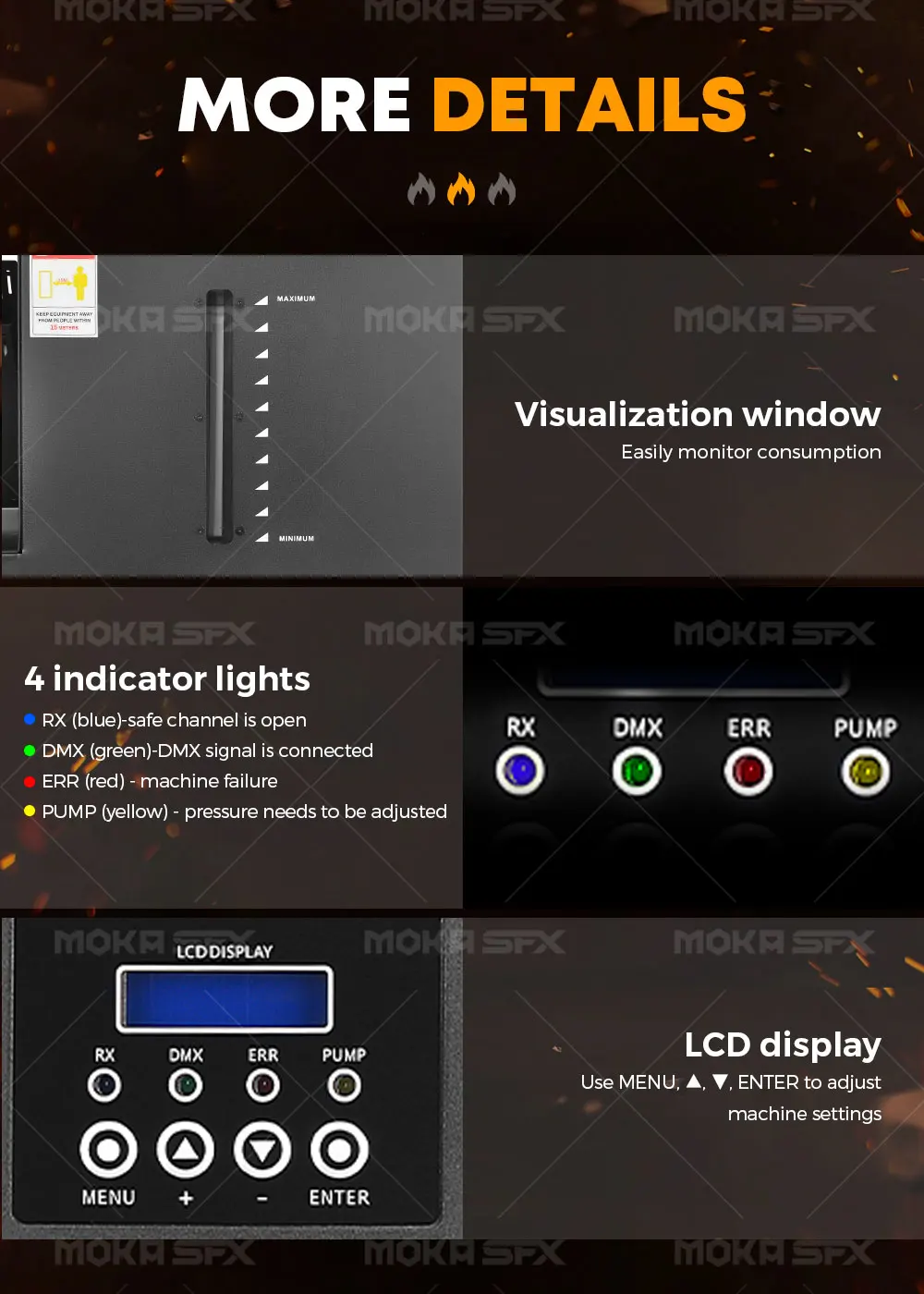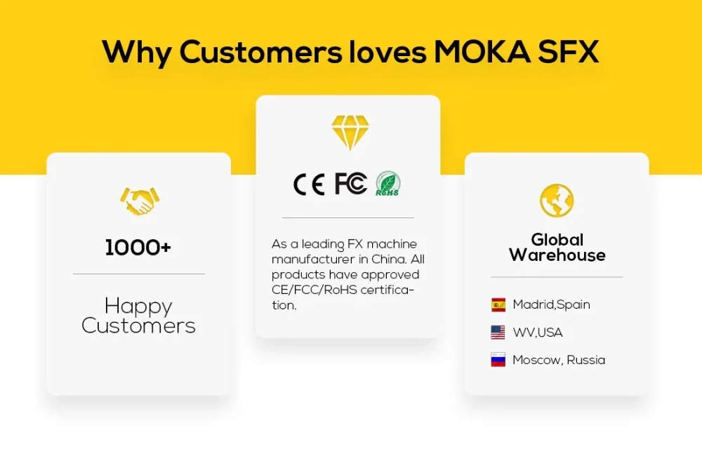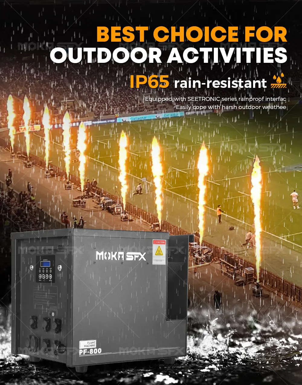¿Cómo garantizar la seguridad al usar SYCN FLAMER en el escenario? MOKA SYCN FLAMER utiliza tecnología y diseño avanzados, la máquina de llama está equipada con múltiples medidas de protección, como bloqueo de seguridad, sensores de temperatura y sistemas de monitoreo de presión, para garantizar que el chorro de llama esté siempre controlado. Además, nuestras máquinas de llama han pasado varias pruebas de seguridad para cumplir con los estándares de la industria, y también le proporcionamos instrucciones de funcionamiento detalladas para garantizar que pueda utilizar estas máquinas de forma segura.