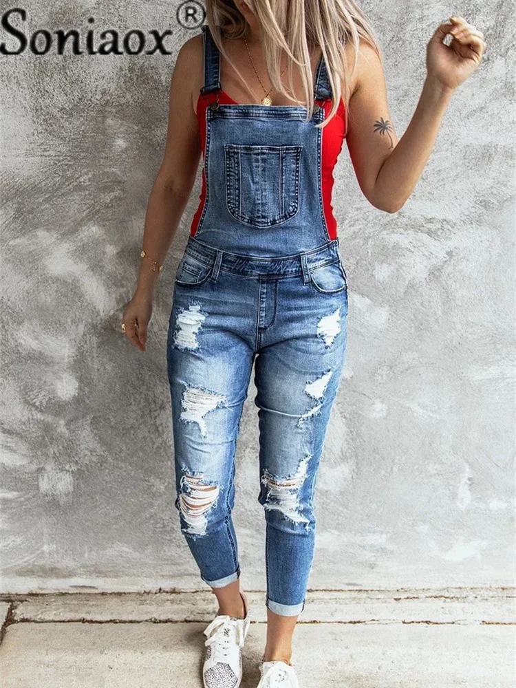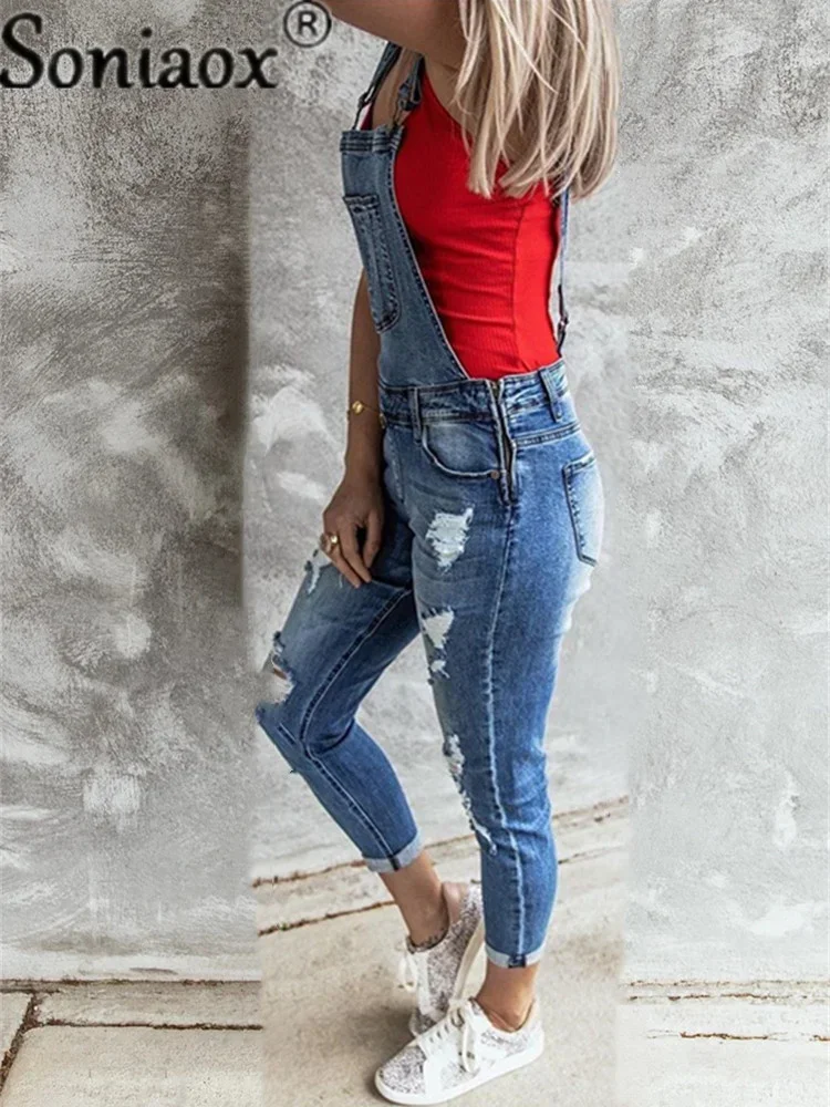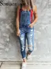 Mono vaquero Sexy para mujer, Peto vaquero ajustado con agujeros rasgados, mono informal con correa para el hombro en forma de Y, mono negro para mujer