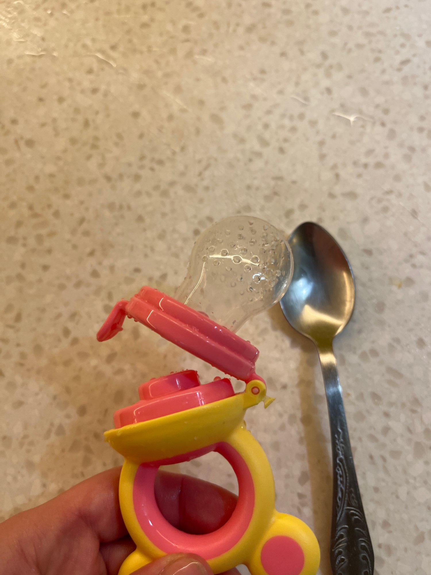 Perfect small handle let every baby enjoy the food by self suitable for most kind of food and can be carried on the trip All food feeder made of excellent silicone material and food grade plastic fit for 4 month+ babg.
