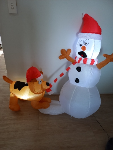 Es tal como se describe, se infla rápidamente y tiene un diseño encantador. Me encanta. Lo único que le faltaría es una luz en la mitad inferior del muñeco de nieve.
