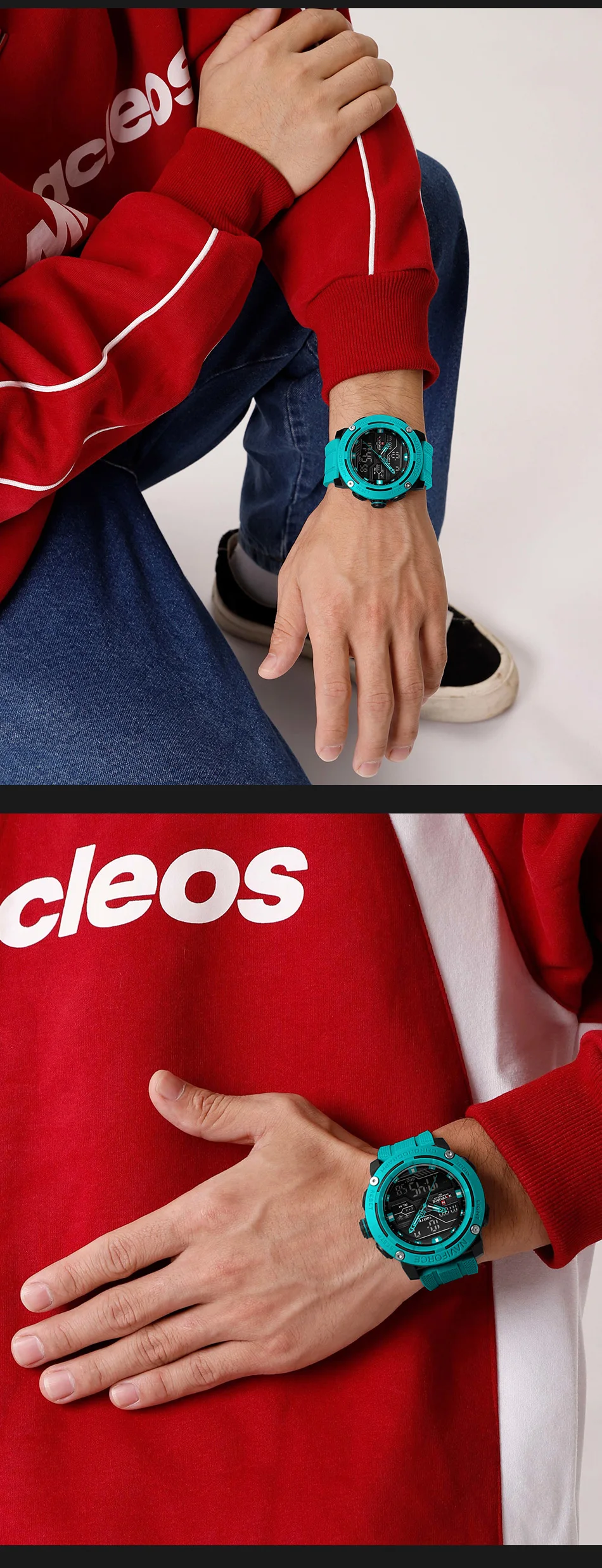 Característica: Resistente al agua hasta 50 m, luminoso; Visualización de hora dual con fecha y día; cronógrafo de alarma; Resistente a arañazos;