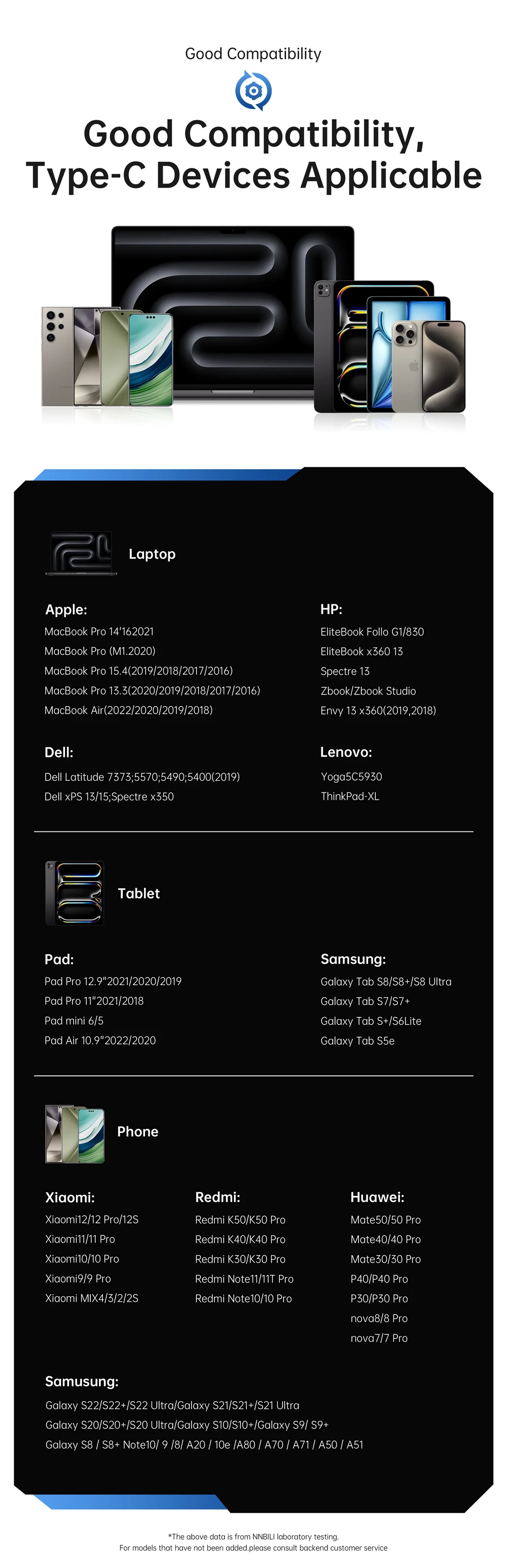 • Carga rápida:Cargue sus dispositivos rápidamente con la tecnología de suministro de energía de 100 W.