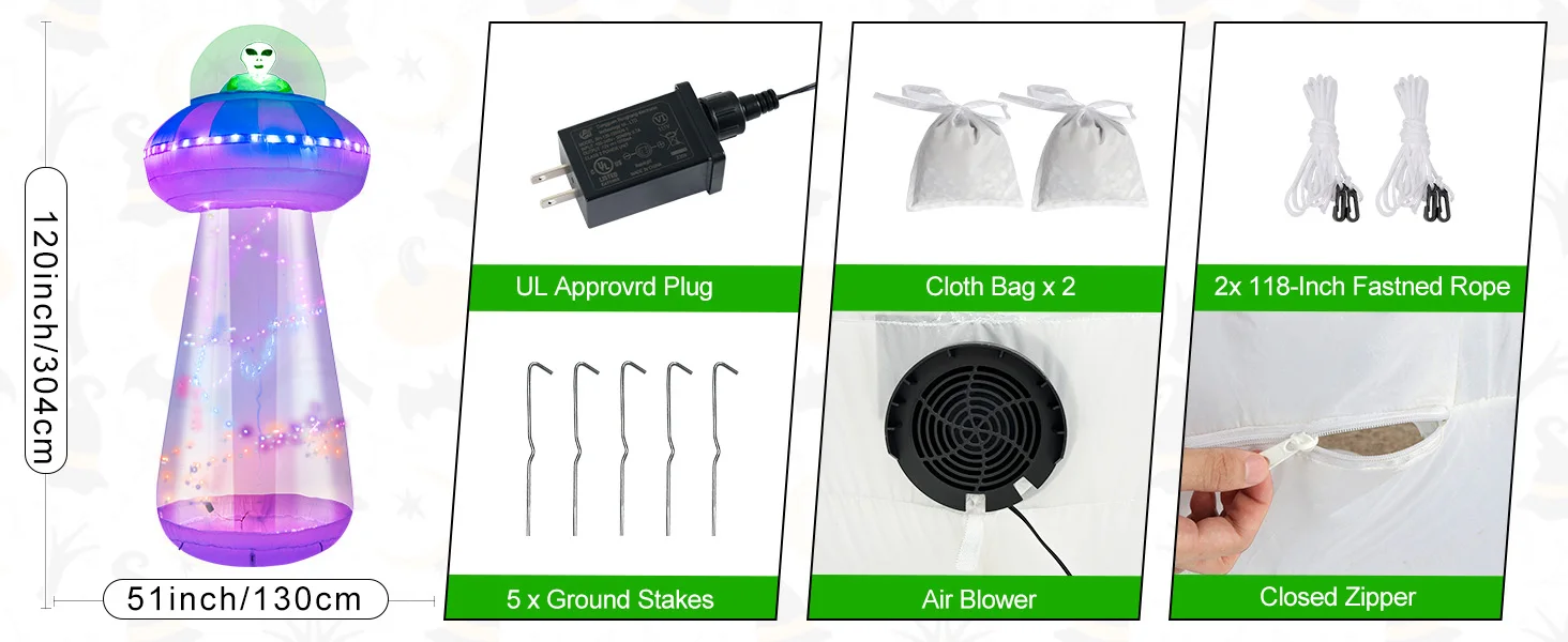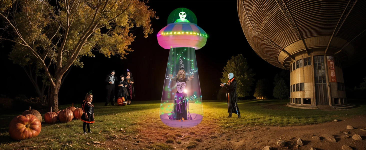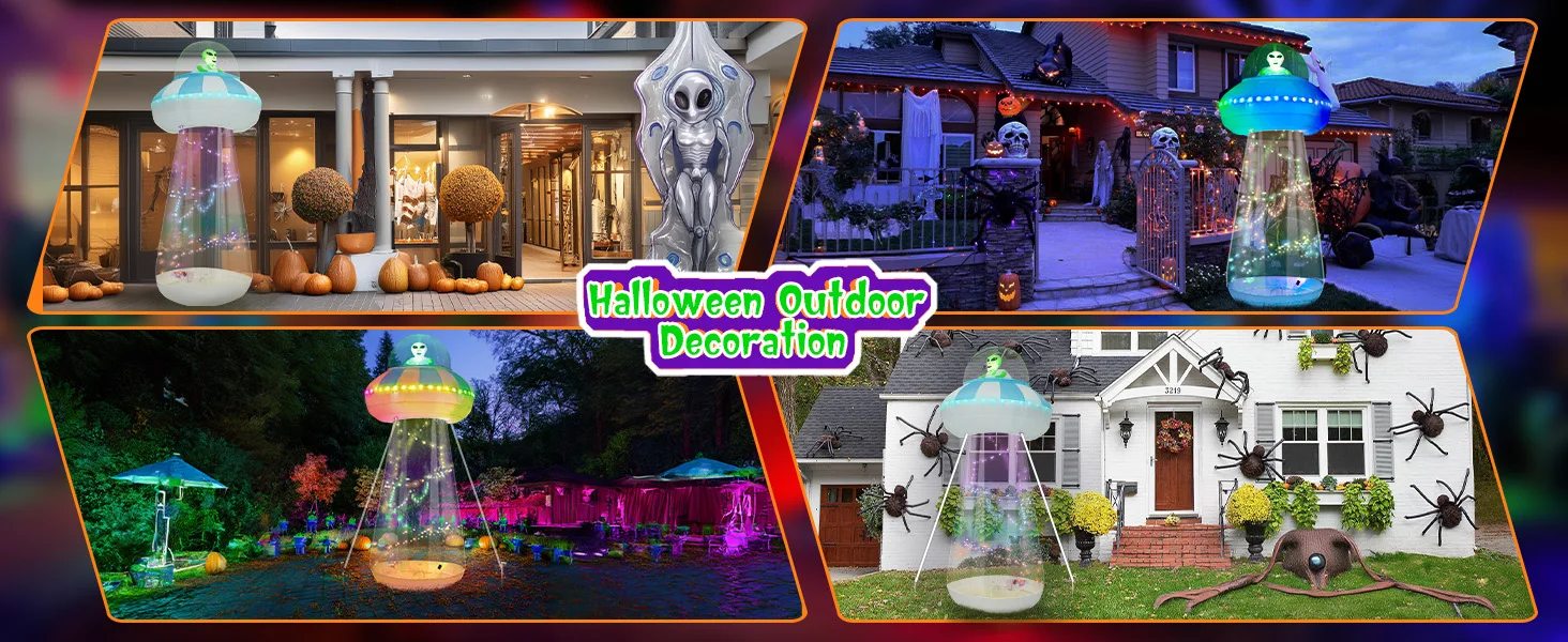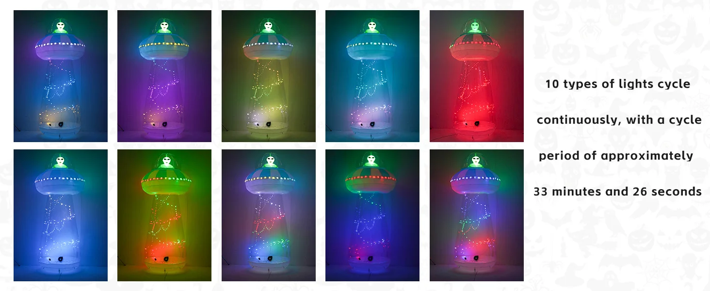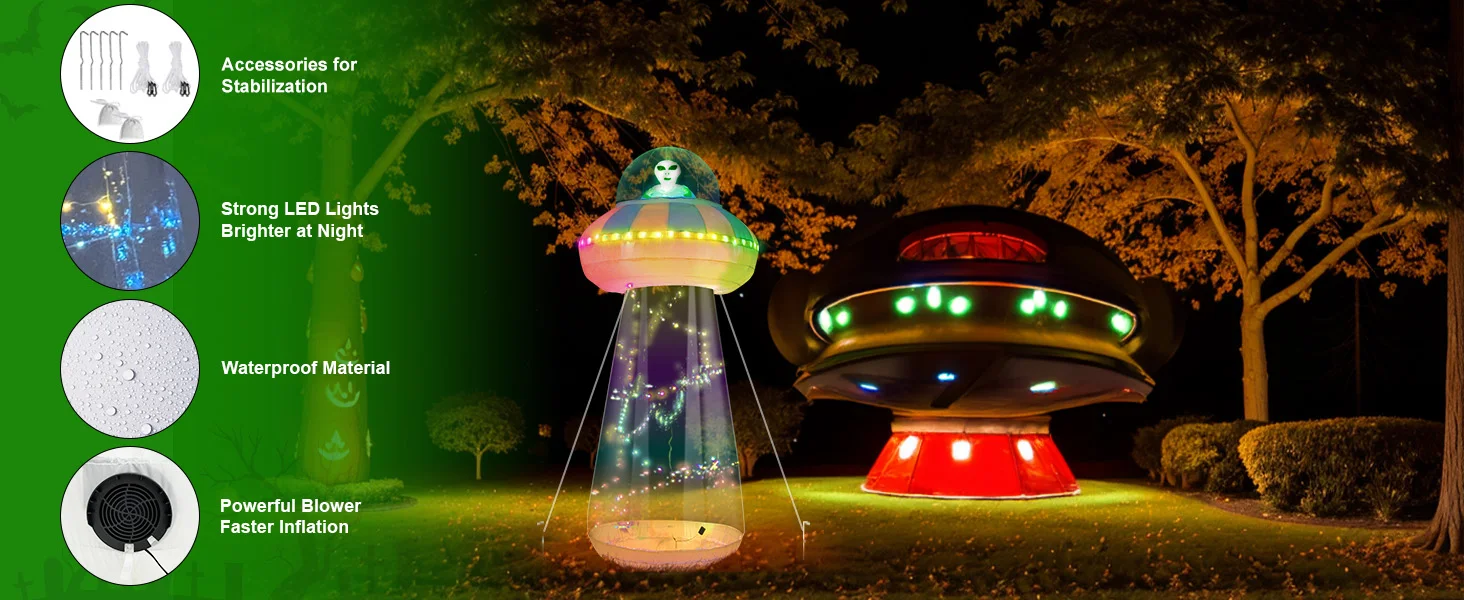 • Diseño creativo de decoraciones inflables para Halloween: entre en el mundo de las maravillas a bordo de nuestra nave espacial alienígena, donde un misterioso extraterrestre espera en las profundidades del OVNI. Descubra la intriga mientras abre la cremallera de la parte inferior de nuestra nave espacial, dando acceso a sus cámaras interiores. La misteriosa nave espacial parpadea en una variedad de modos de luces de funcionamiento, llevándote a otro tiempo y espacio.