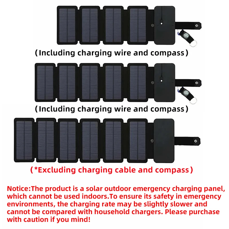 * El producto es un panel solar de carga de emergencia al aire libre, que no se puede utilizar en interiores. Para garantizar su seguridad en entornos de emergencia, la velocidad de carga puede ser ligeramente más lenta y no se puede comparar con los cargadores domésticos. ¡Compra con precaución si te importa!