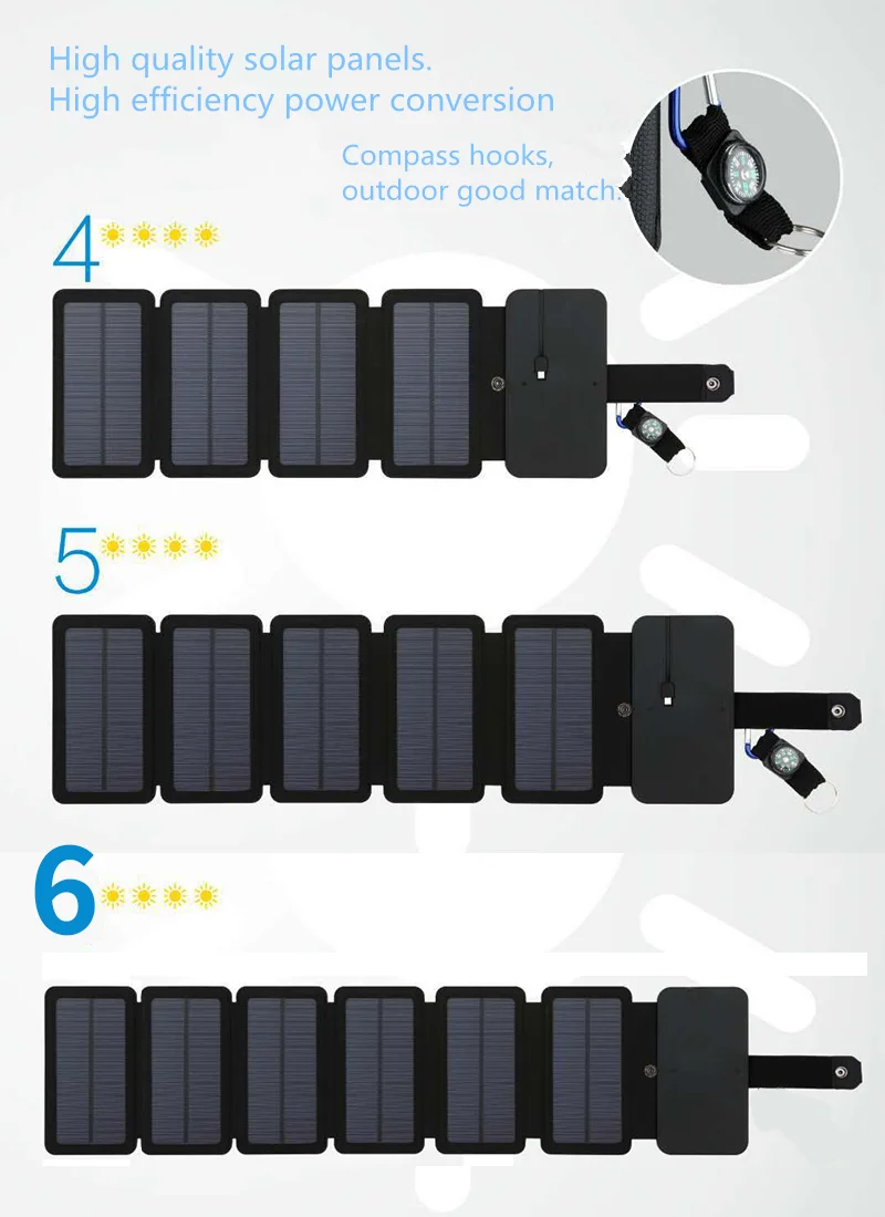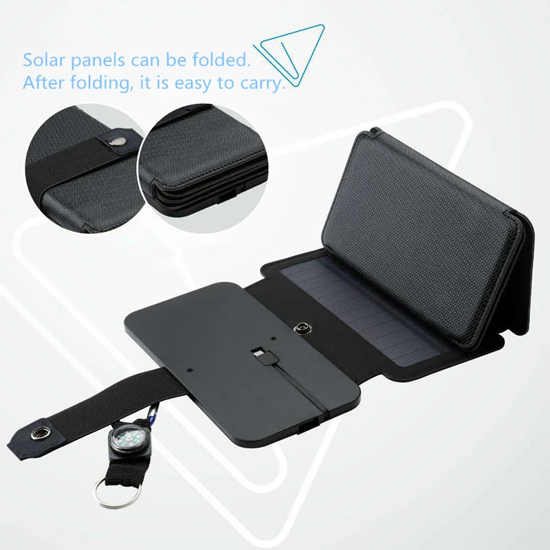 • Diseño Plegable:El diseño plegable del panel de carga solar hace que sea fácil de llevar y almacenar en su mochila.