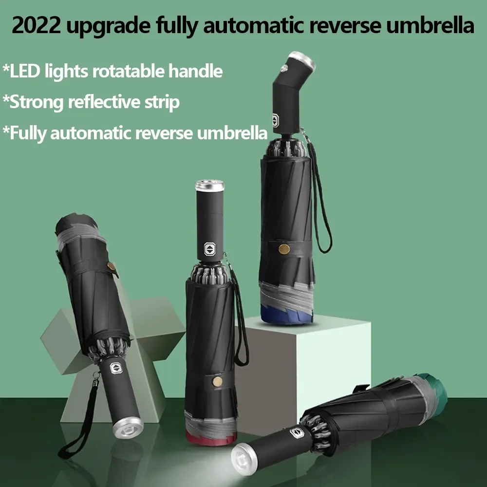 Paraguas de protección solar totalmente automático, plegable, impermeable, con linterna LED, UV, resistente a la lluvia y al viento