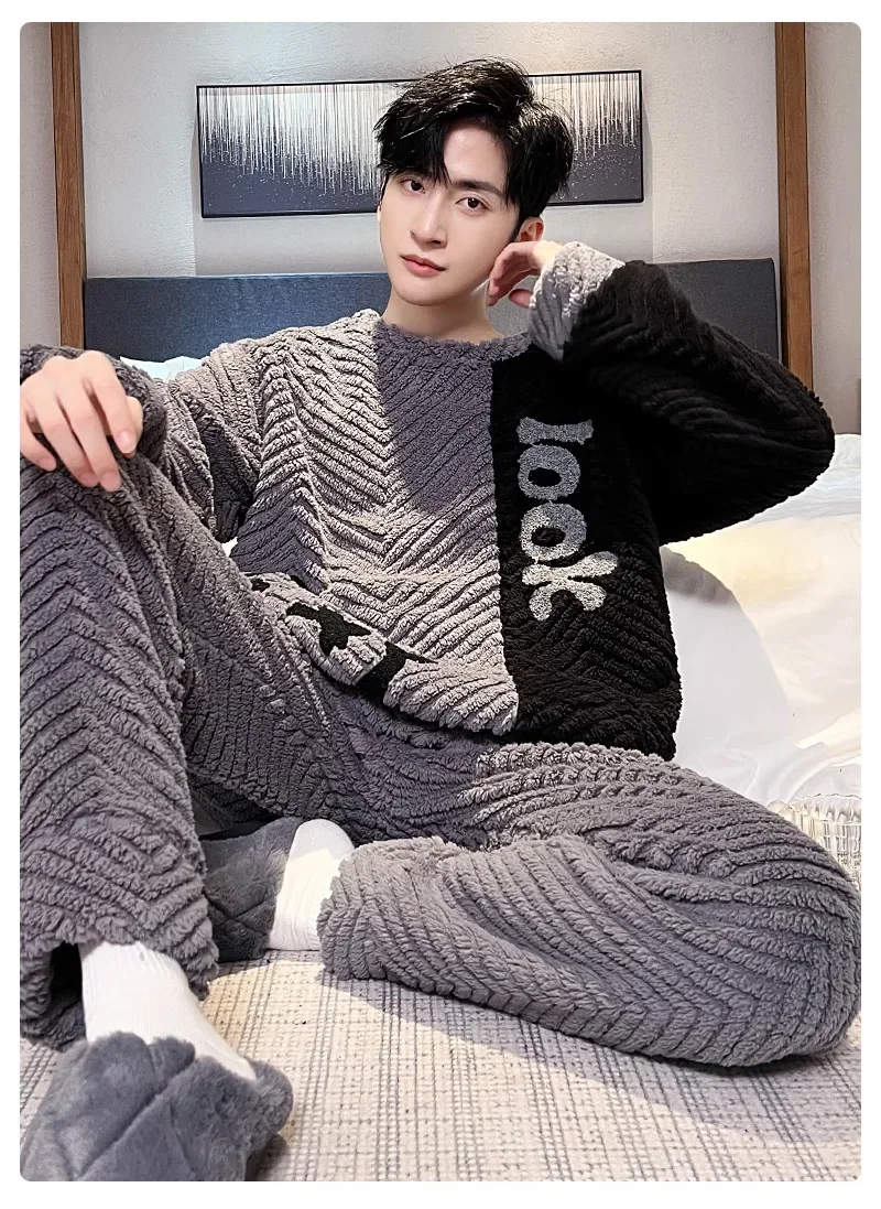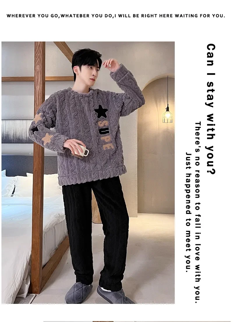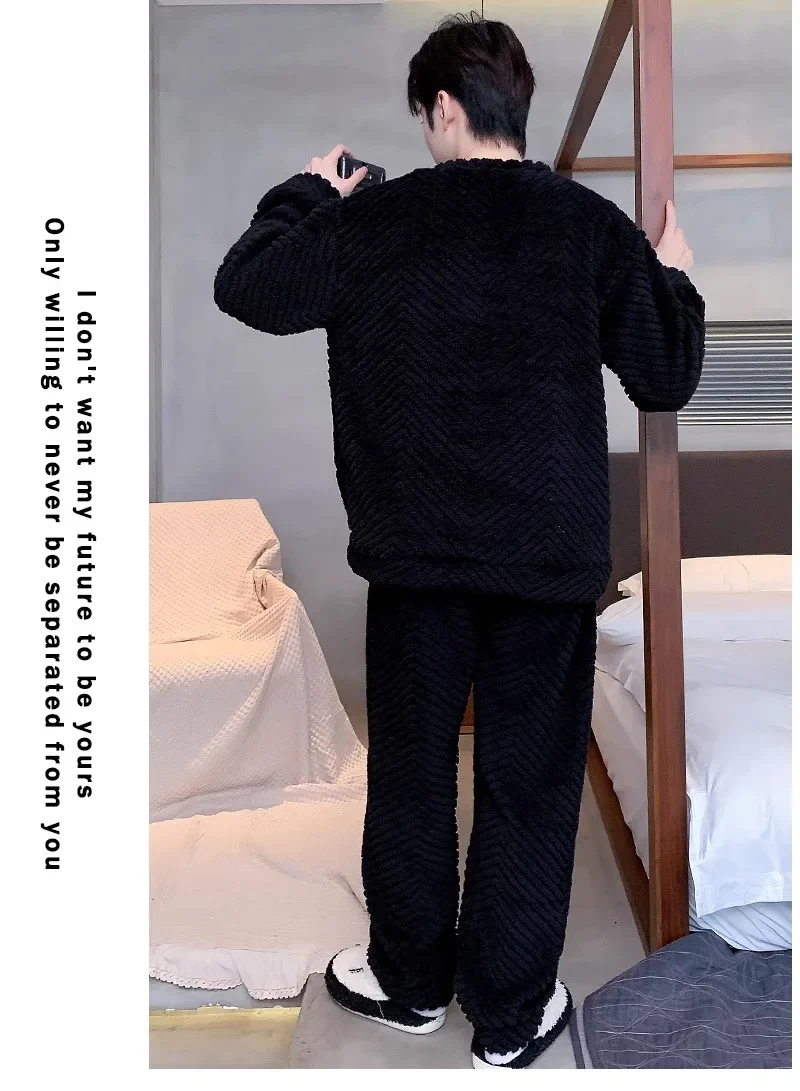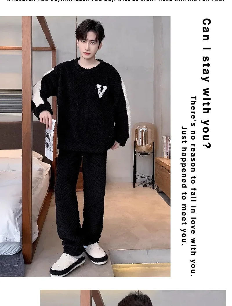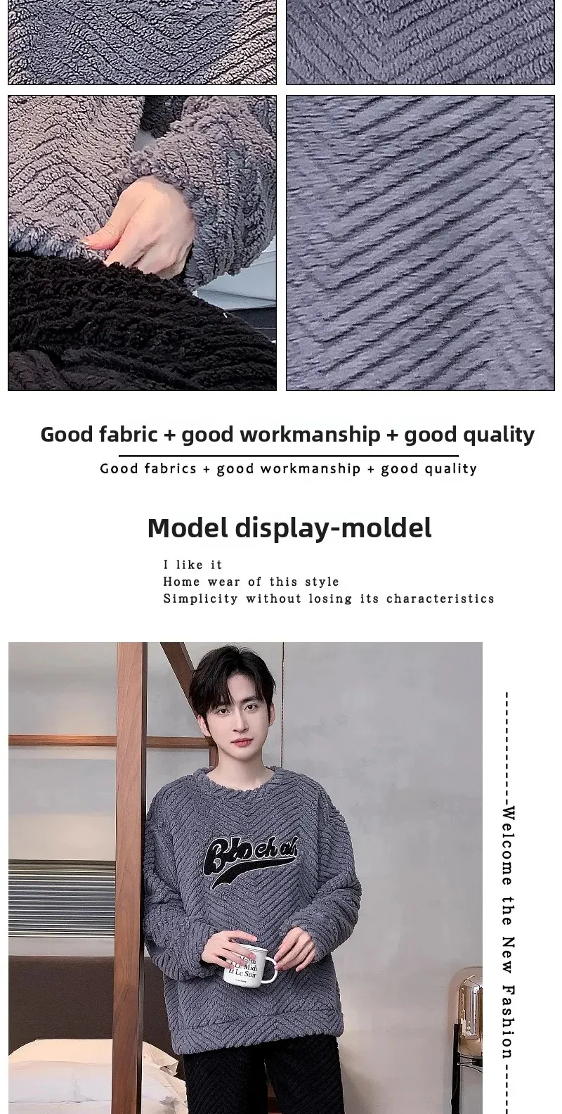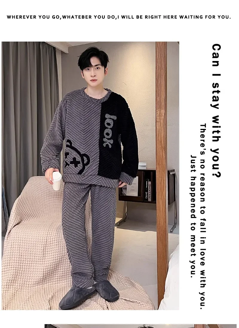 Pijamas gruesos de lana Coral para hombre, ropa cálida para el hogar, conjunto de dos piezas de franela, traje para casa de felpa para otoño e invierno
