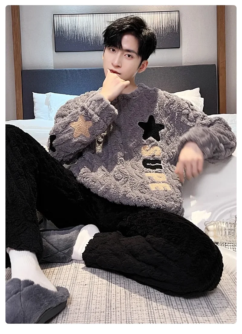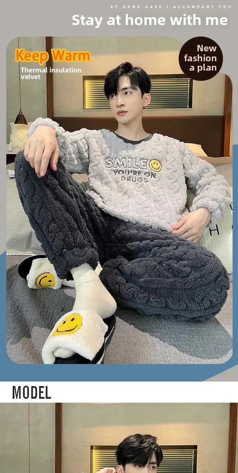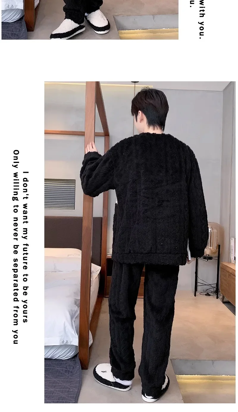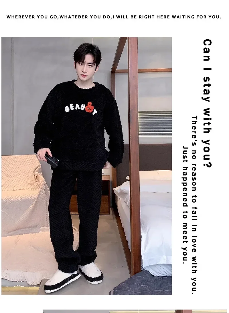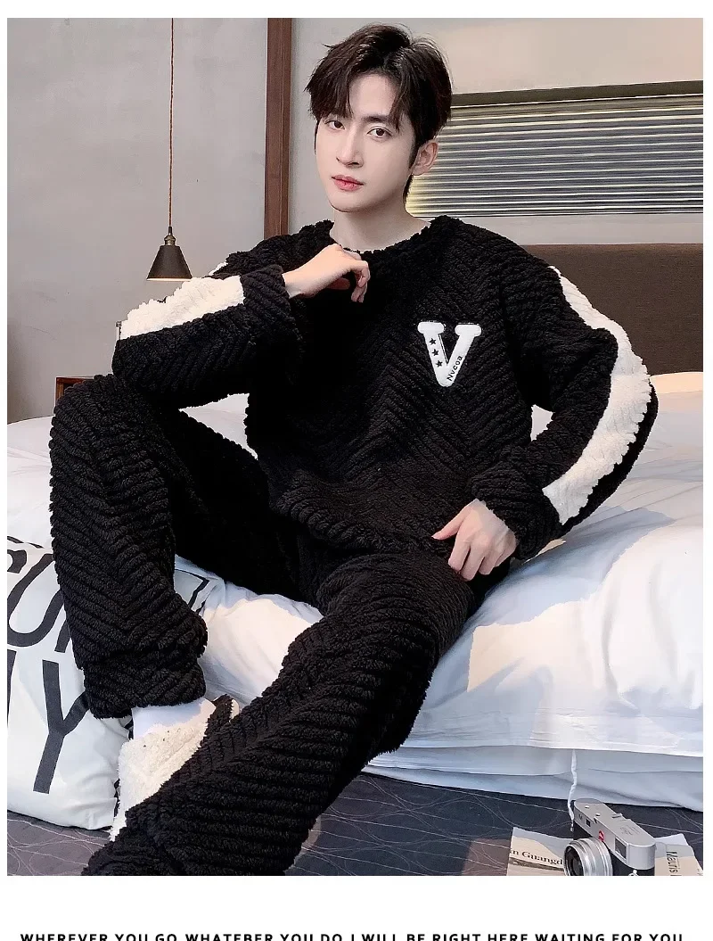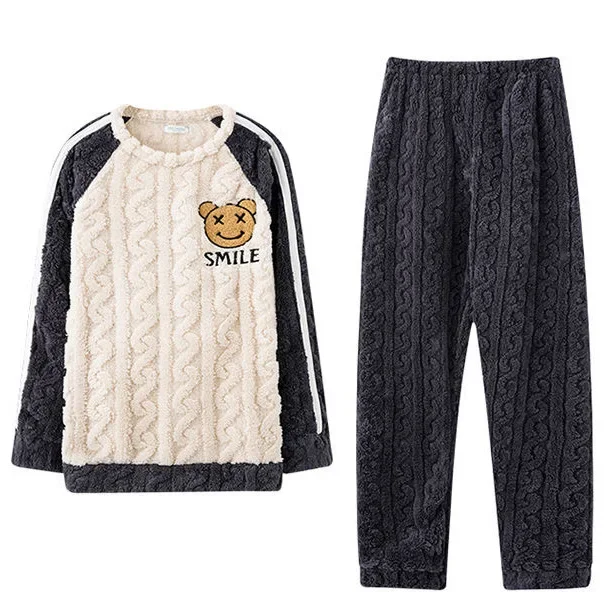 Pijamas gruesos de lana Coral para hombre, ropa cálida para el hogar, conjunto de dos piezas de franela, traje para casa de felpa para otoño e invierno