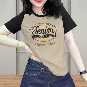 Camiseta de algodón para mujer, Tops de manga corta con cuello redondo y estampado en contraste, edición coreana, novedad de verano, 2023