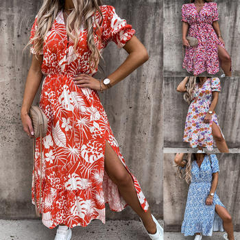 Vestido de verano con estampado Floral para mujer, vestido largo con escote en V, abertura lateral, manga corta, botones, ajustado, fiesta, Primavera