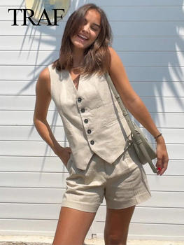 TRAF-Conjunto De dos piezas formado por chaleco sin mangas y pantalones cortos con bolsillos para Mujer, color blanco liso, 2024