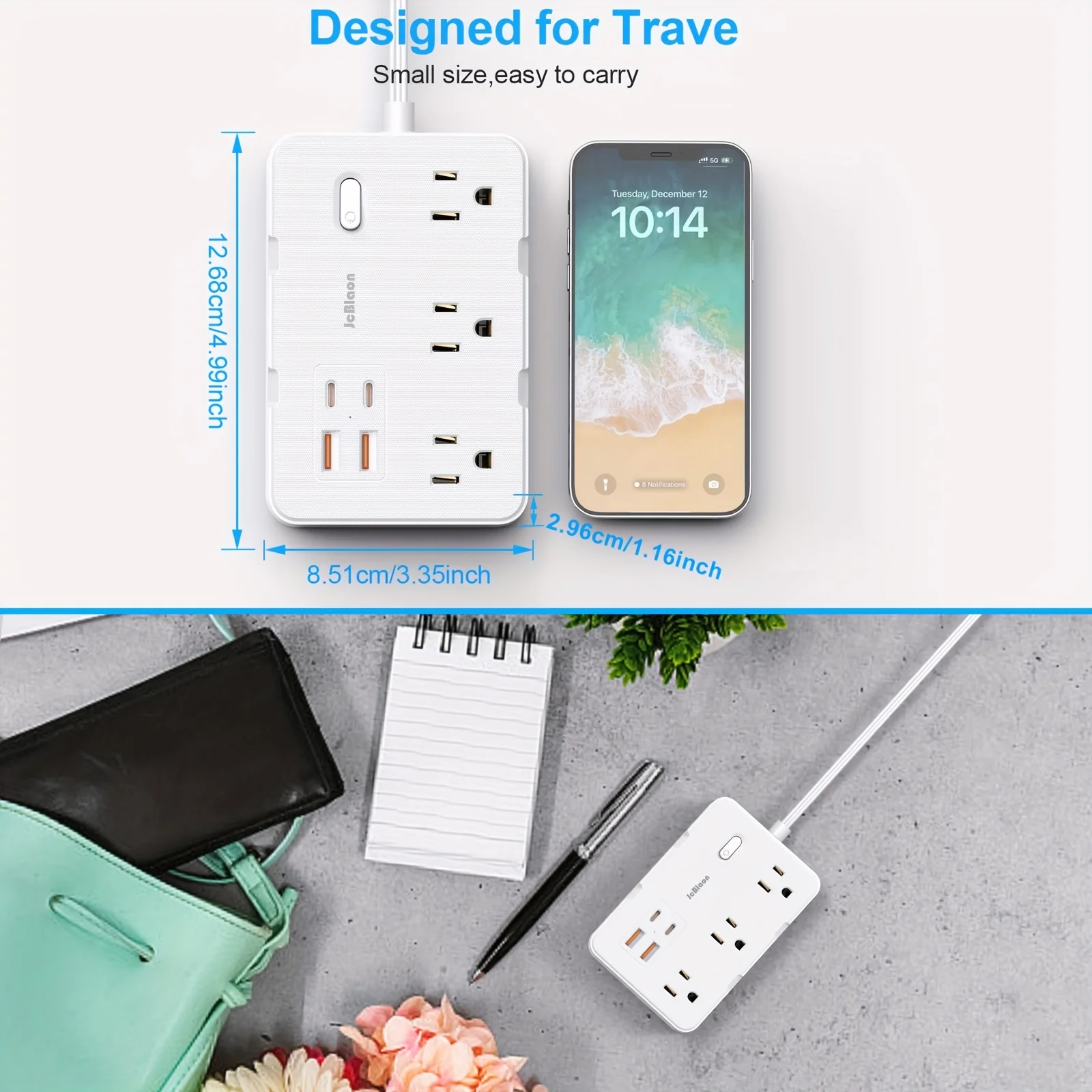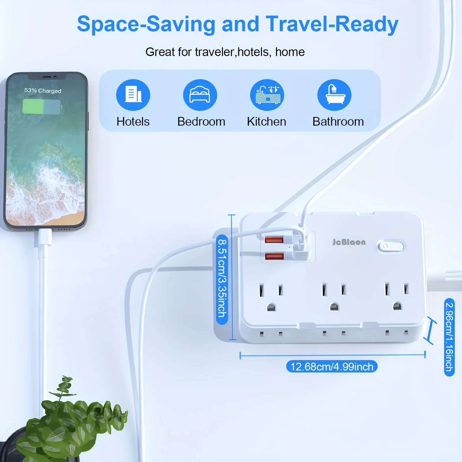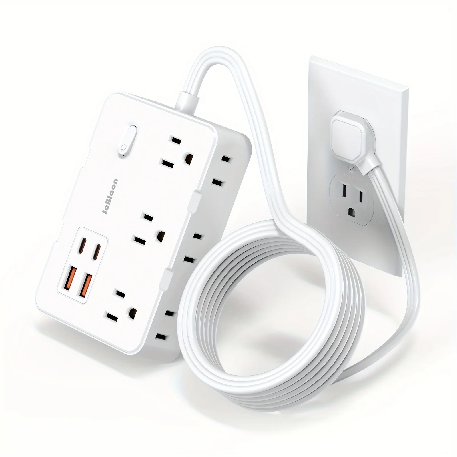 Adaptador de corriente de 5 pies Protección contra sobretensiones con 6 tomas amplias Extensor 4 puertos USB (2 USB C), montaje en pared, estación de carga de escritorio para el hogar, la oficina, la escuela, los viajes y los artículos esenciales para el dormitorio