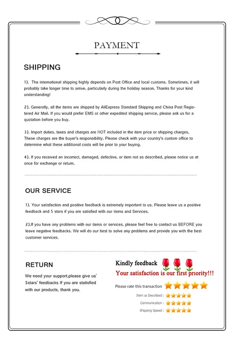 Los paquetes desde nuestro almacén en China se enviarán por ePacket o EMS, dependiendo del peso y tamaño del producto. Los paquetes enviados desde nuestro almacén en los Estados Unidos se envían a través de USPS.