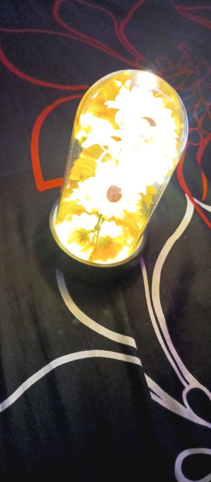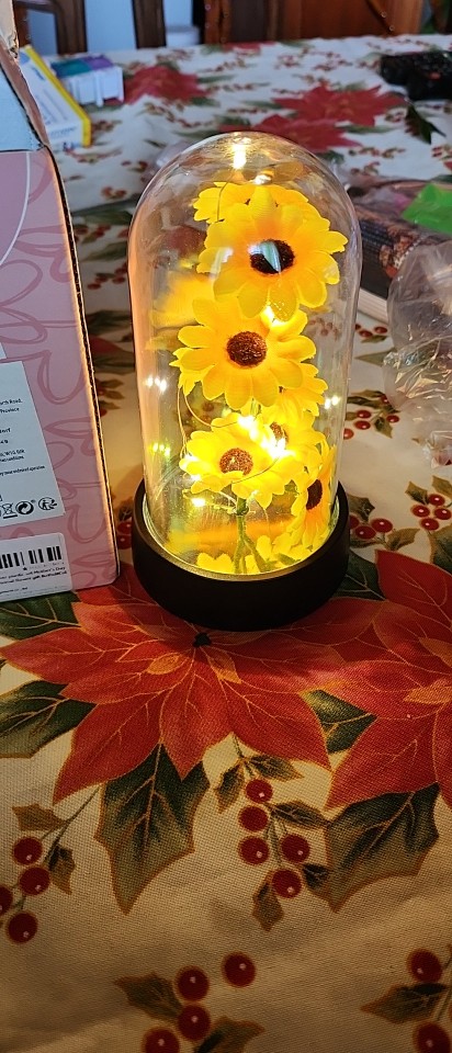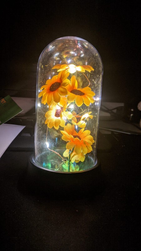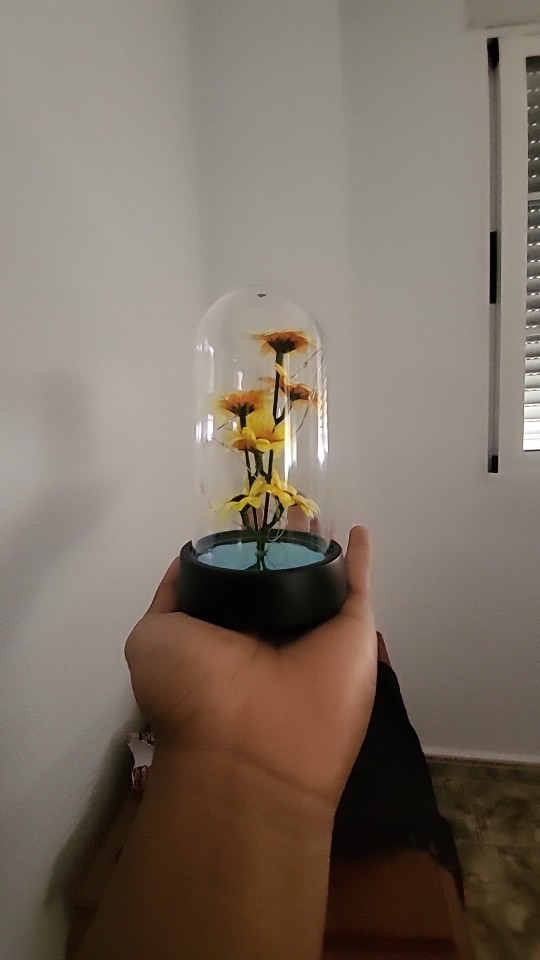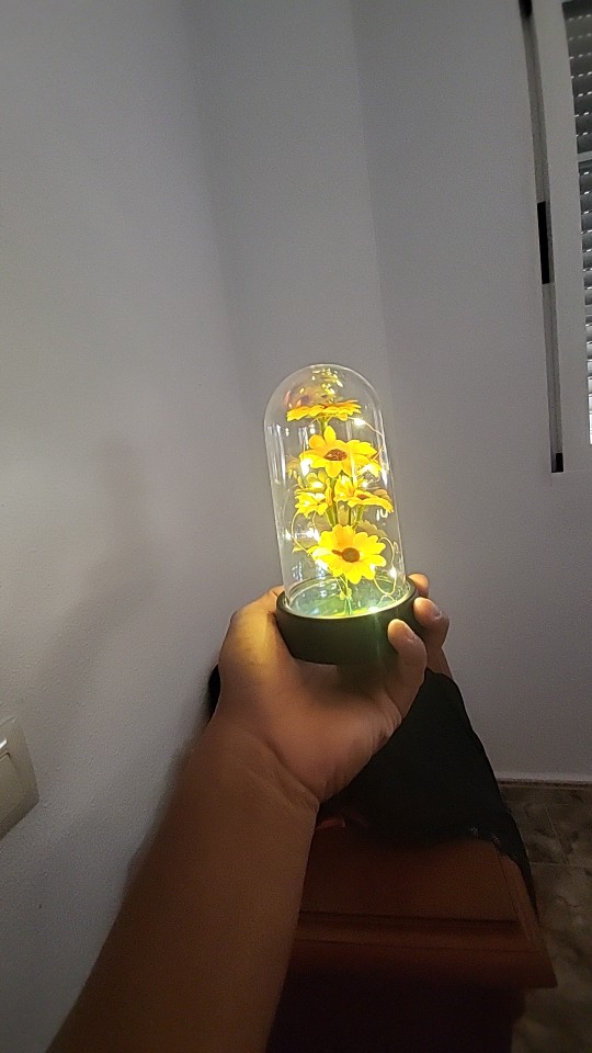 Se demoró un poco en llegar, pero es normal, solo es ser paciente. El producto está muy bien, tiene buena calidad y brilla mucho. Está muy lindo, los girasoles se ven buenos y el interruptor que está abajo, también se ve bueno. Vino en una caja rosa con una abertura en forma de corazón, muy resistente también