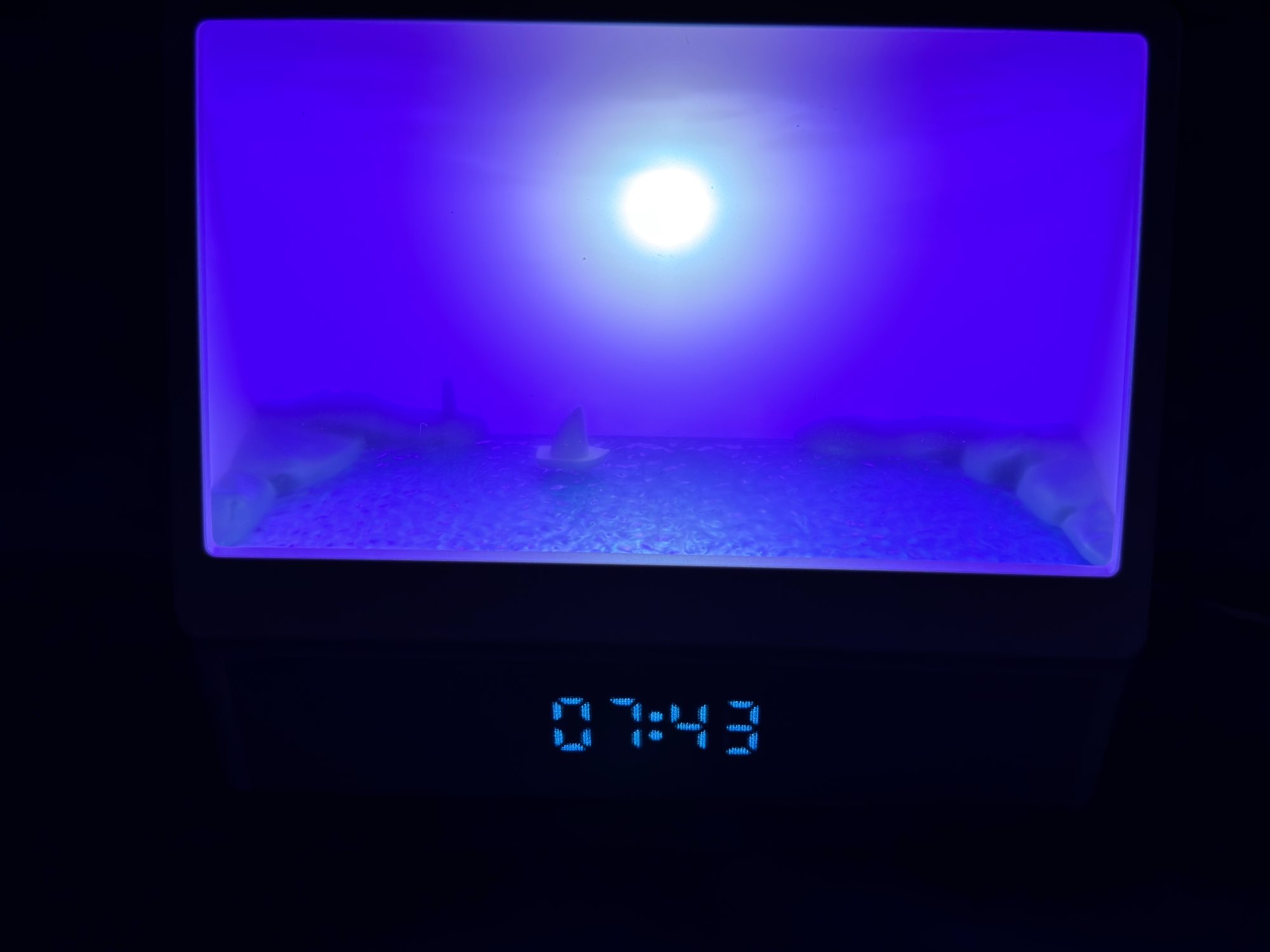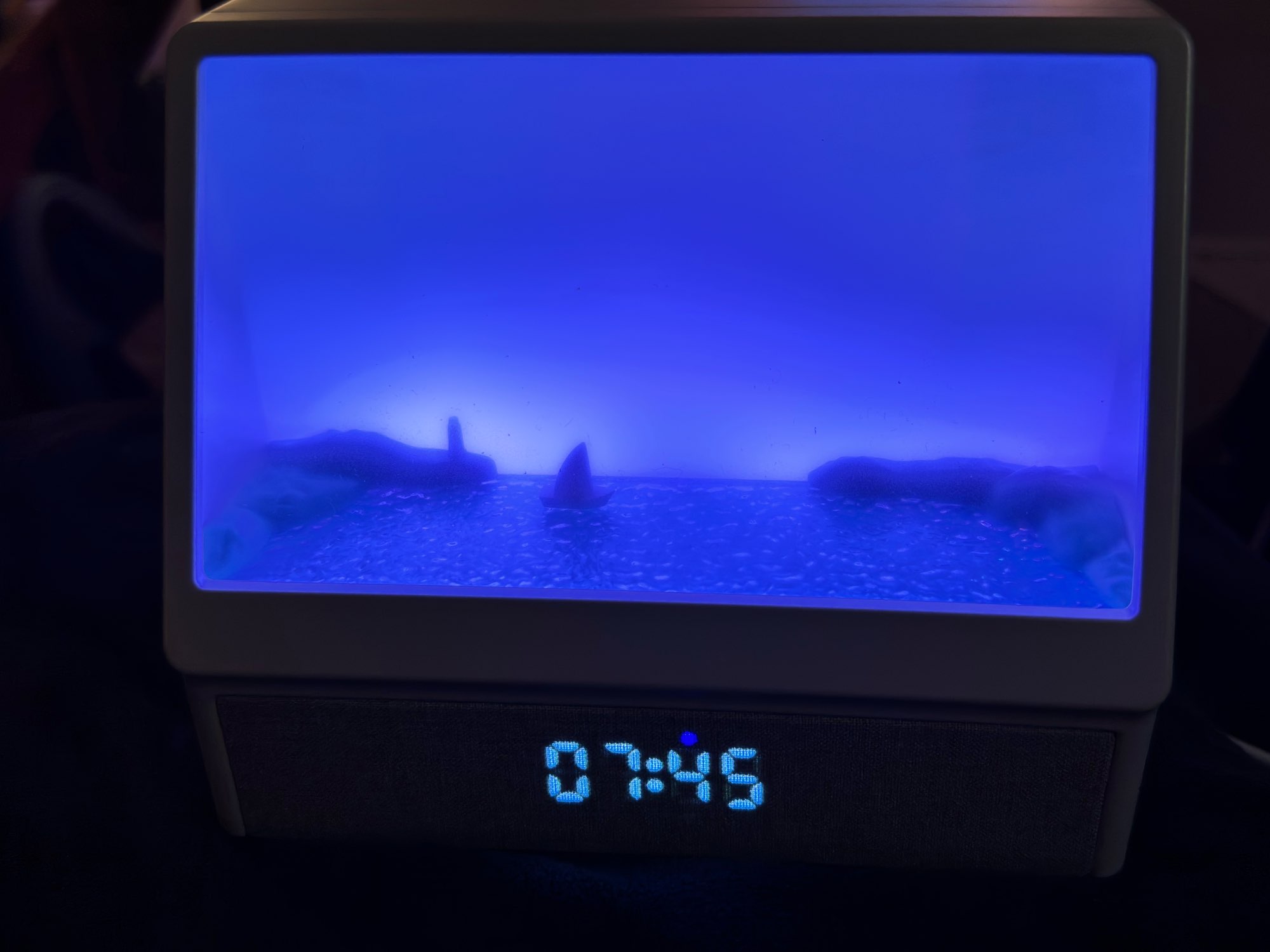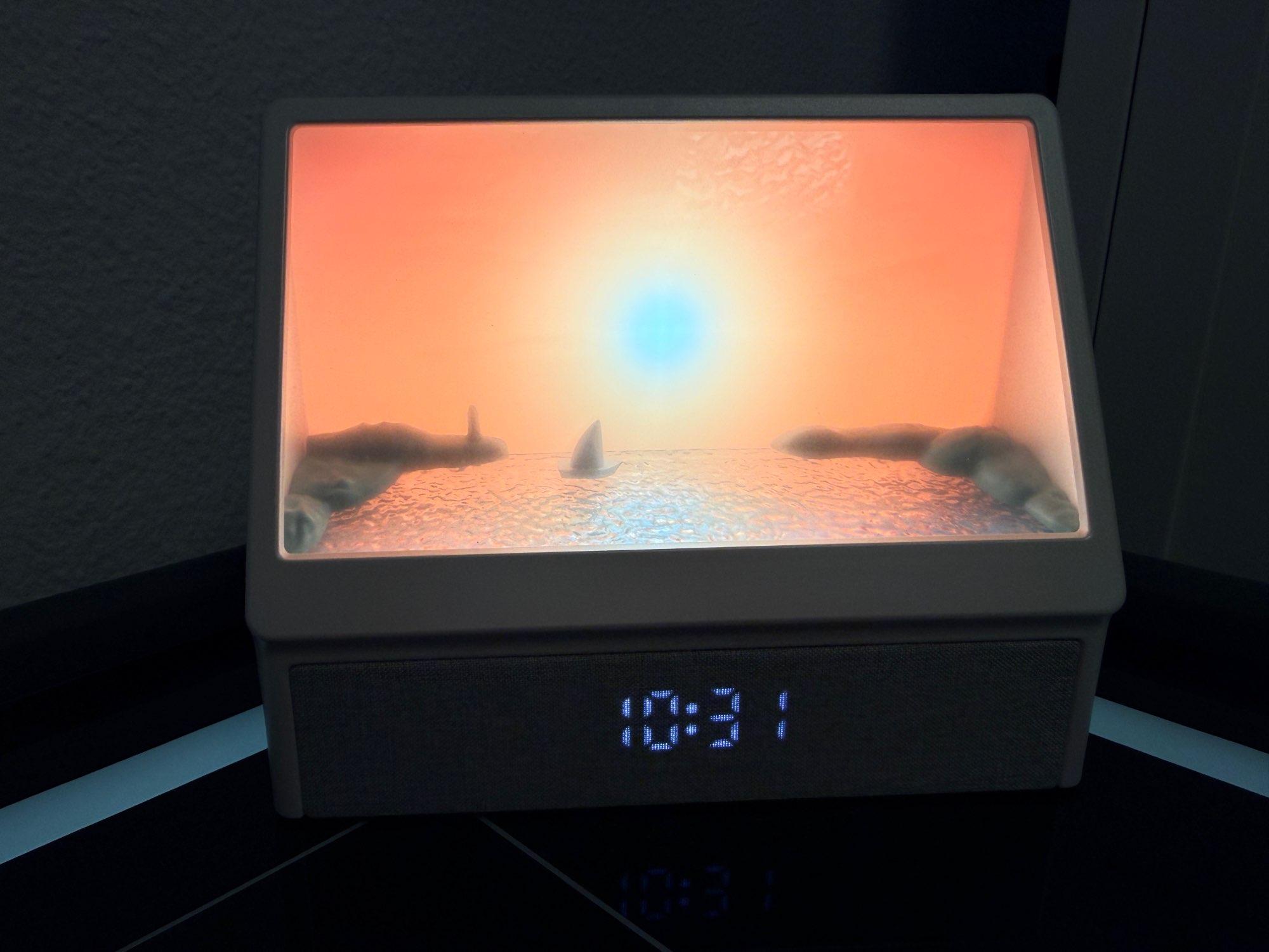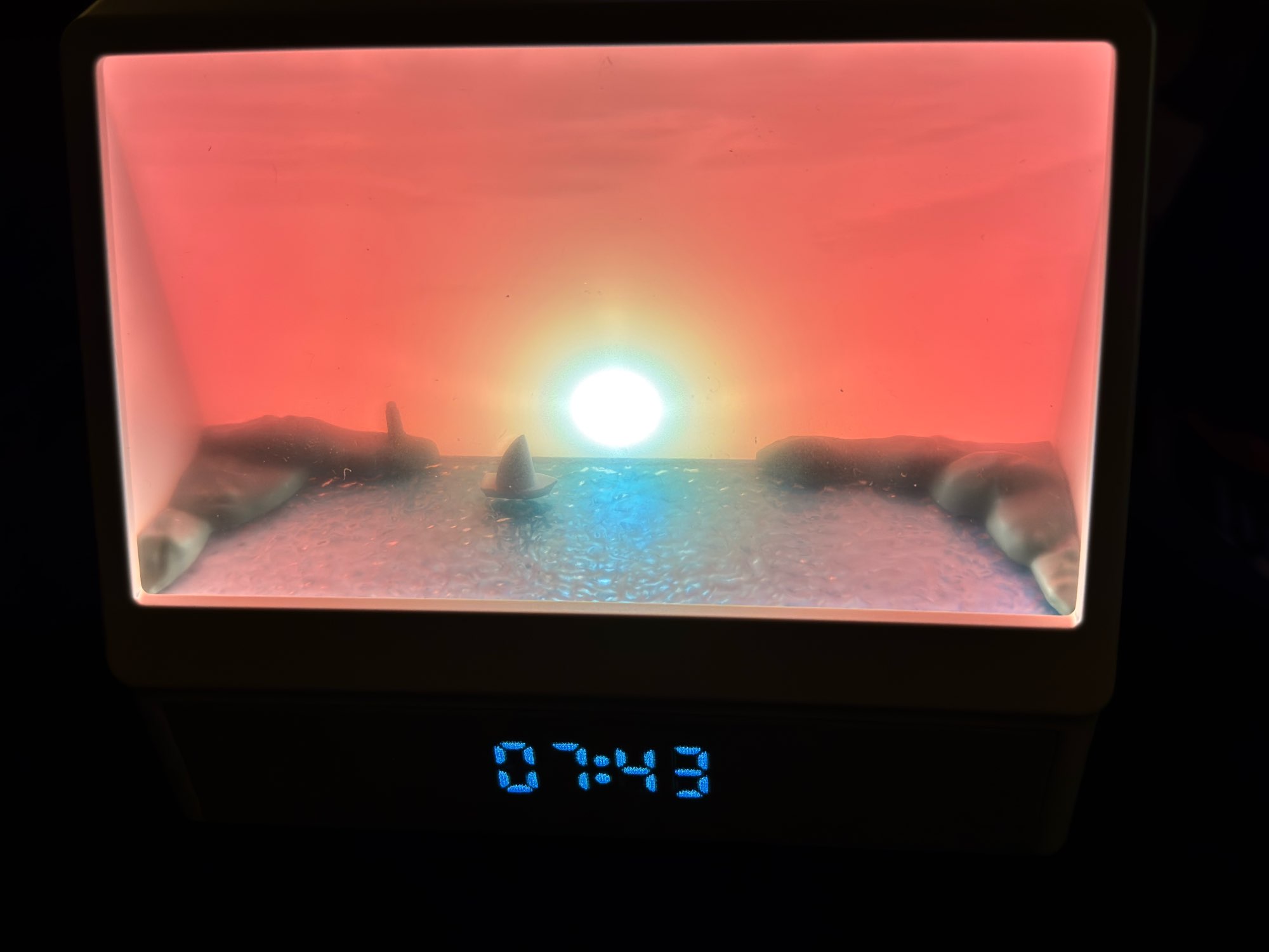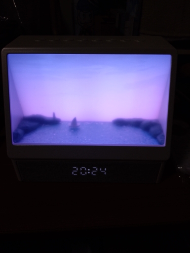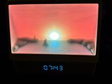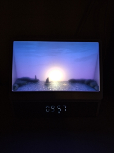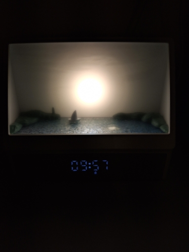 Es una pena que no pueda añadir un video, es tan hermoso, un empaque genial, sería una compra digna tanto para ti como para regalar. Muchos modos, ruido del mar, música, llamadas de gaviotas, amanecer y muchos otros colores de retroiluminación sin movimiento del sol. Es una belleza, el tamaño es perfecto, en la foto puedes ver cómo el despertador se coloca en la mesita de noche. El brillo es ajustable. Muchas gracias al vendedor por un buen producto.
