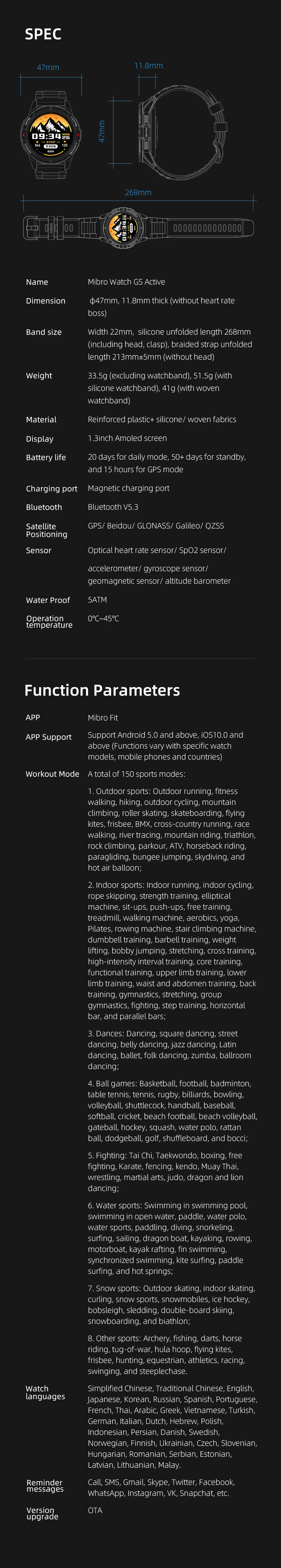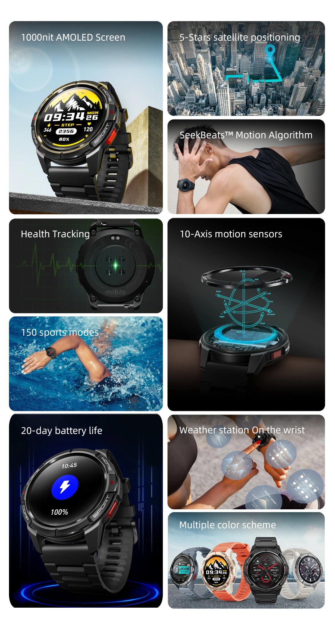 Pantalla AMOLED de 1000 nits| Posicionamiento satélite de 5 estrellas| Algoritmo de movimiento SeekBeats| Seguimiento de la salud| 150 modos deportivos| Sensores de movimiento de 10 ejes| Duración de la batería de 20 días| Estación meteorológica en la muñeca| Esquema de colores múltiples