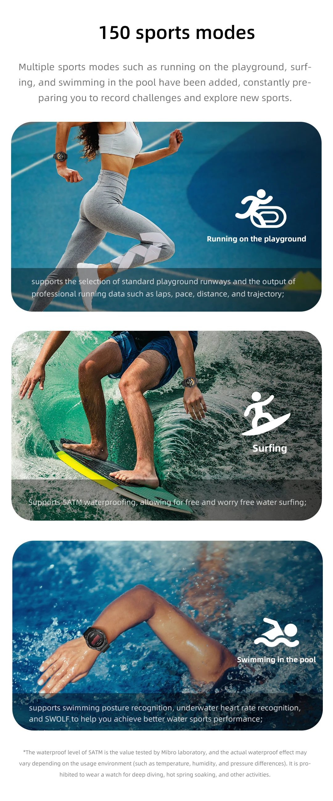 *El nivel de impermeabilidad de 5 ATM es el valor probado por el laboratorio Mibro y el efecto real de impermeabilidad puede variar según el entorno de uso (como diferencias de temperatura, humedad y presión).Está prohibido usar un reloj para buceo profundo, remojo de aguas termales y otras actividades.Los daños al producto causados por la entrada de agua no están cubiertos por la garantía.