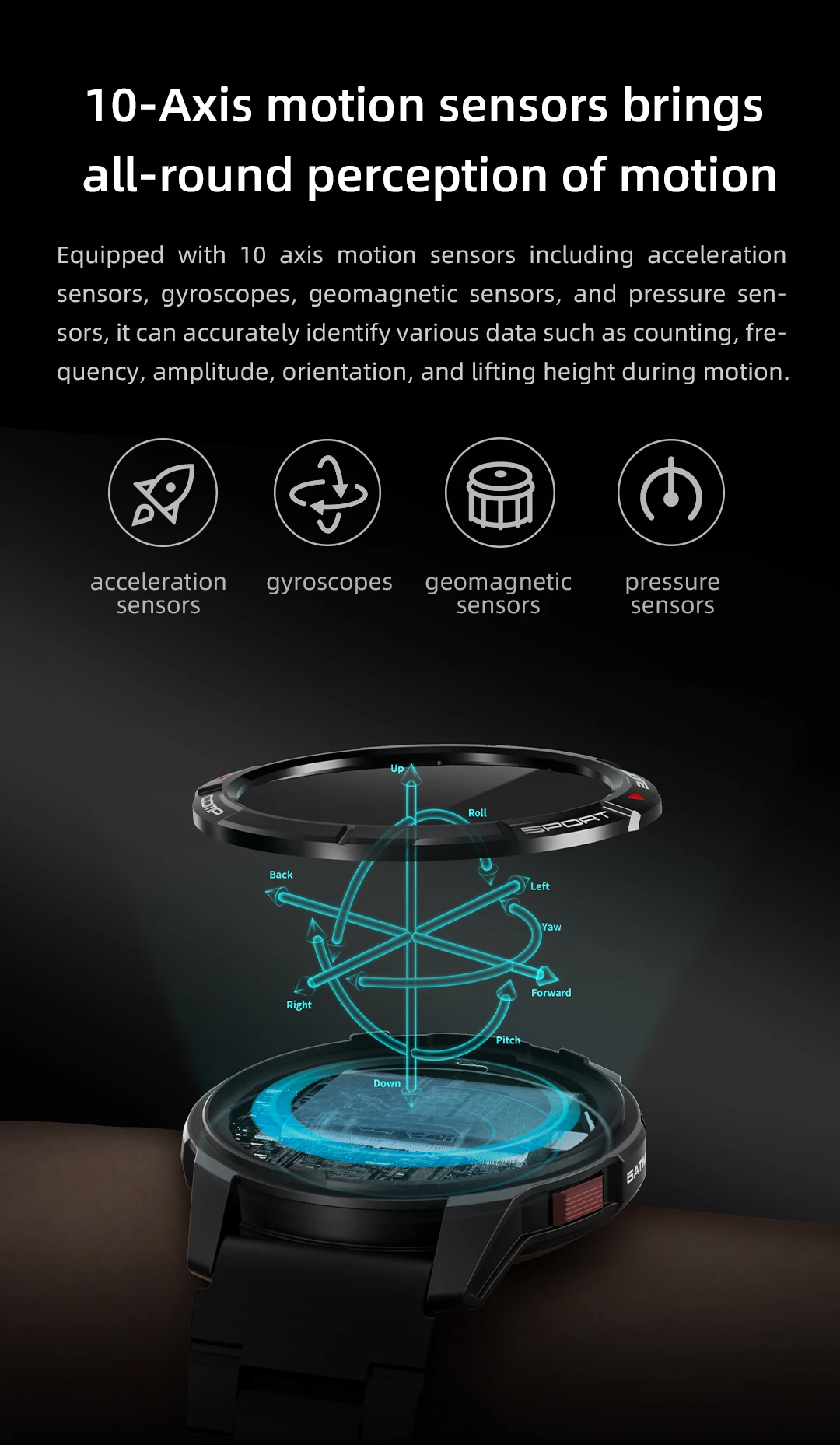 Equipado con sensores de movimiento de 10 ejes que incluyen sensores de aceleración, giroscopios, sensores geomagnéticos y sensores de presión, puede identificar con precisión varios datos como conteo, frecuencia, amplitud, orientación y altura de elevación durante el movimiento.