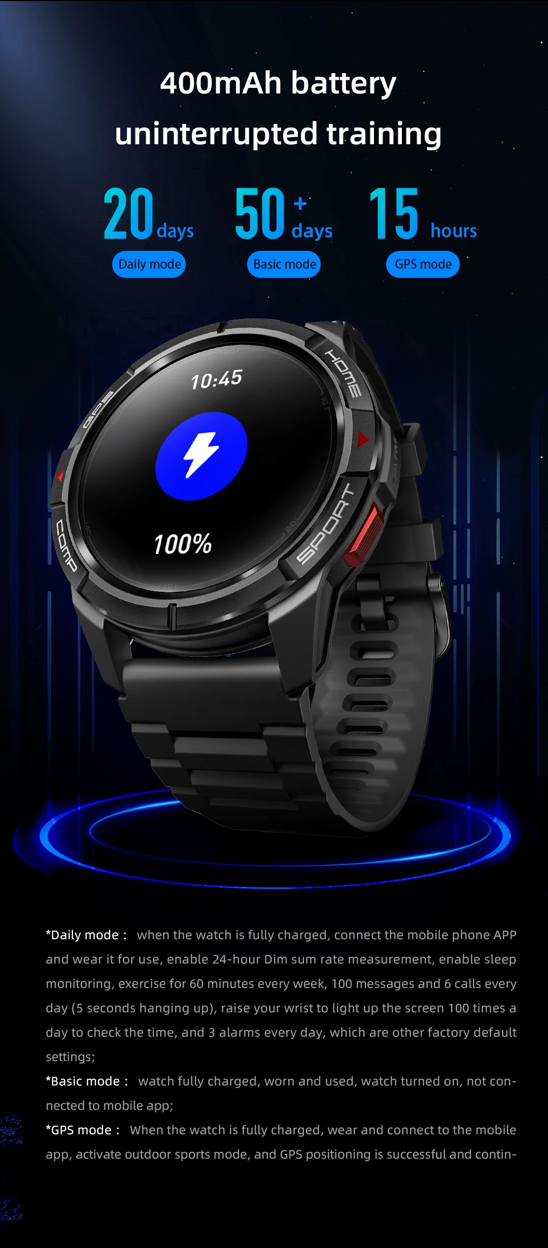 *Modo básico: reloj completamente cargado, usado y usado, reloj encendido, no conectado a la aplicación móvil;