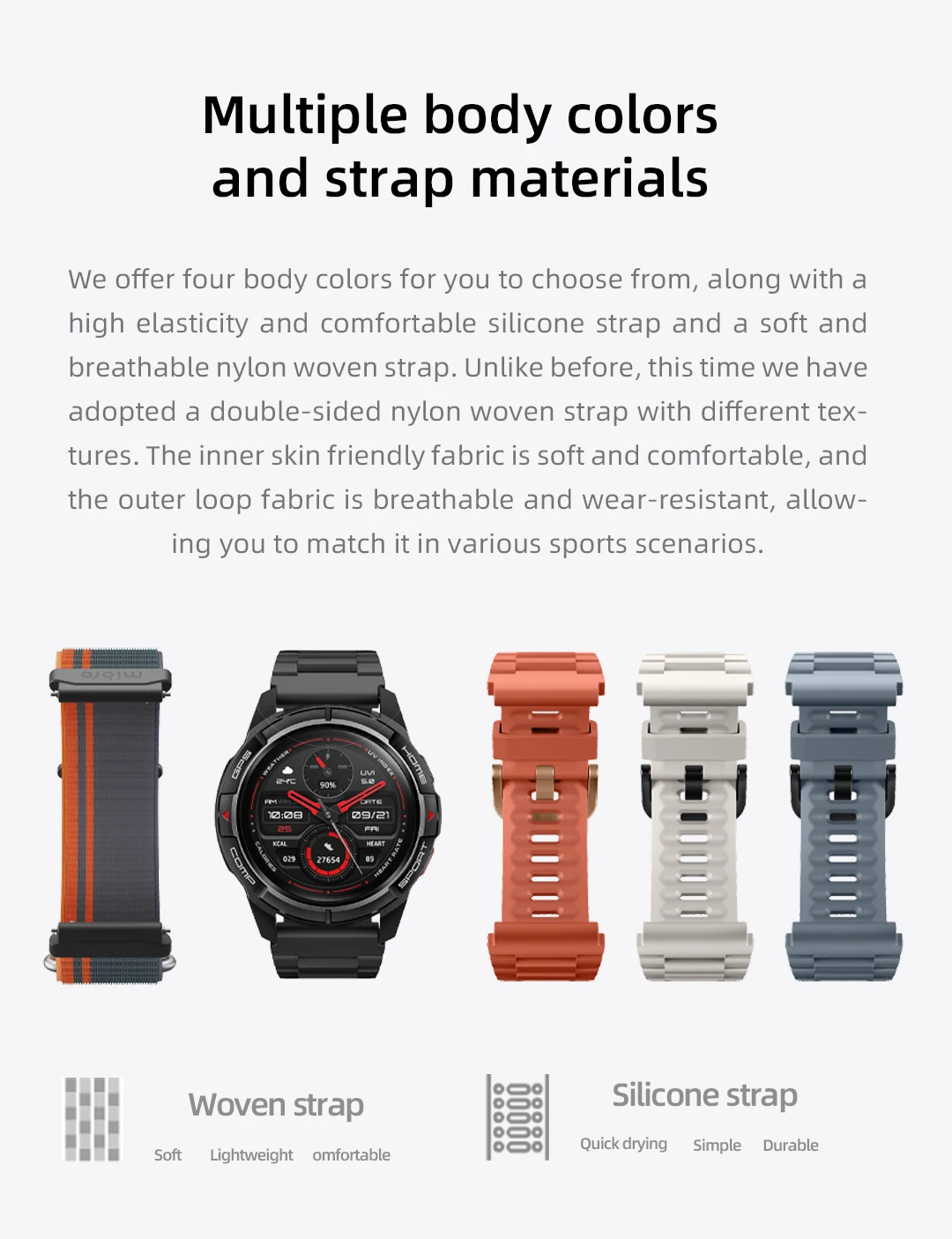 Ofrecemos cuatro colores de cuerpo para que elijas, junto con una correa de silicona cómoda y de alta elasticidad y una correa tejida de nailon suave y transpirable.A diferencia de antes, esta vez hemos adoptado una correa tejida de nailon de doble cara con diferentes texturas.La tela interior agradable para la piel es suave y cómoda, y la tela exterior es transpirable y resistente al desgaste, lo que le permite combinarla en varios escenarios deportivos.