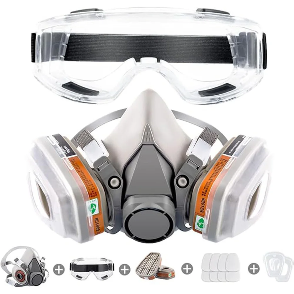 【INCLUYE】: 1x media máscara facial, 1x gafas de seguridad, 2x cajas de filtros reemplazables, 8x filtros de algodón, 2 x Fundas de plástico.