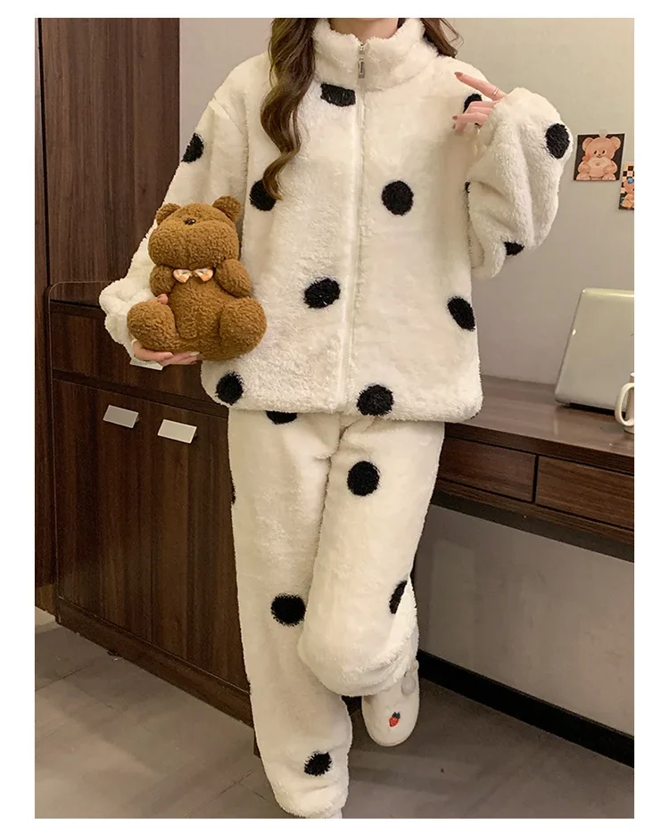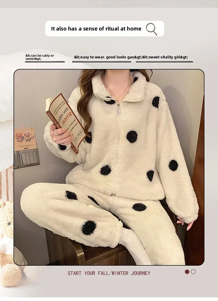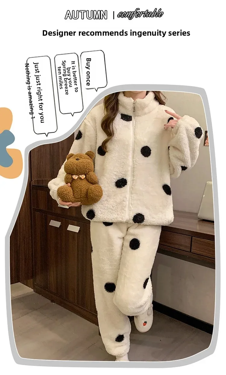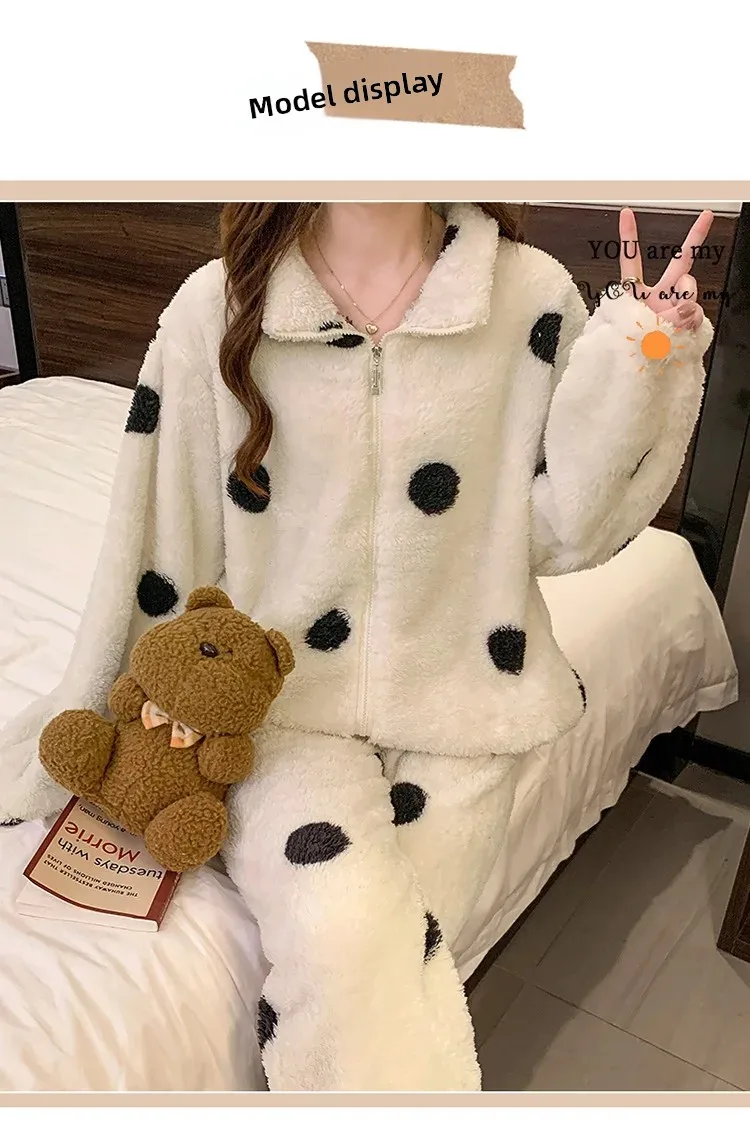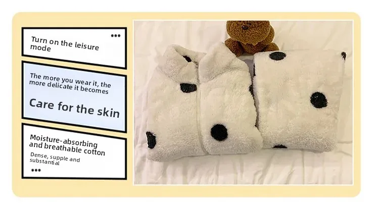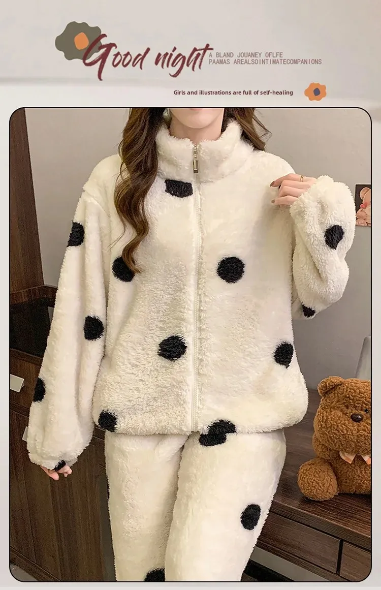 • Diseño de lunares:El diseño de lunares añade un toque de diversión y feminidad a esta acogedora ropa de hogar, convirtiéndola en una opción elegante para descansar.