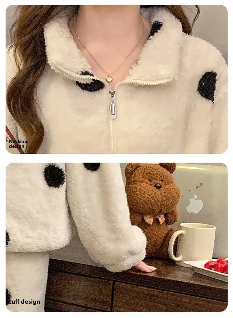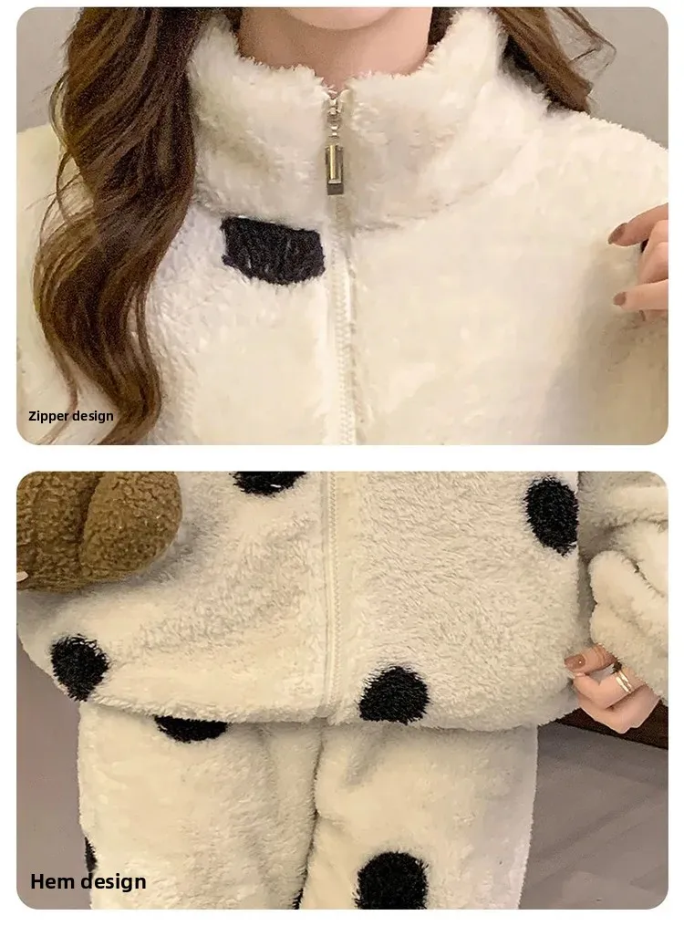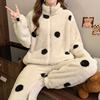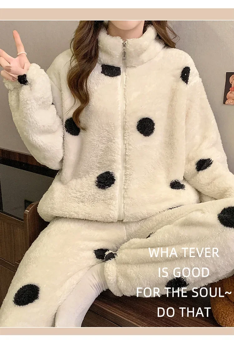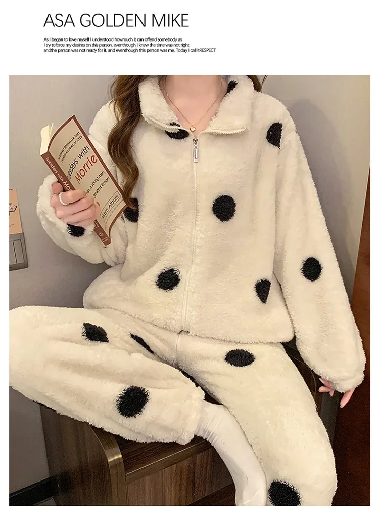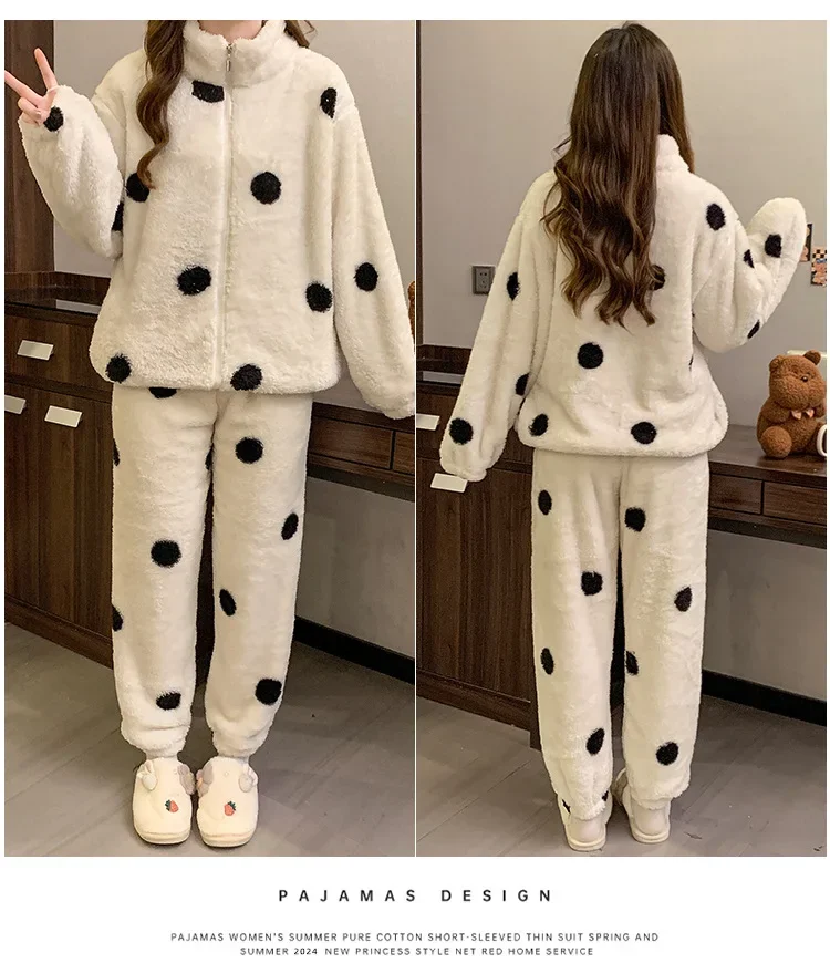 • Diseño de lunares:El diseño de lunares añade un toque de diversión y feminidad a esta acogedora ropa de hogar, convirtiéndola en una opción elegante para descansar.