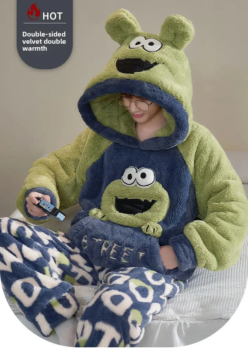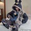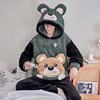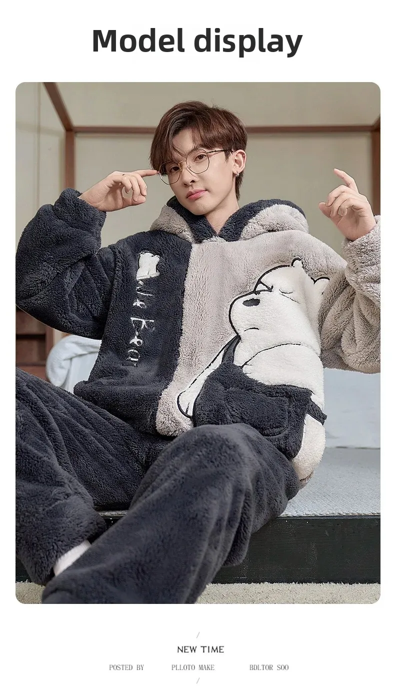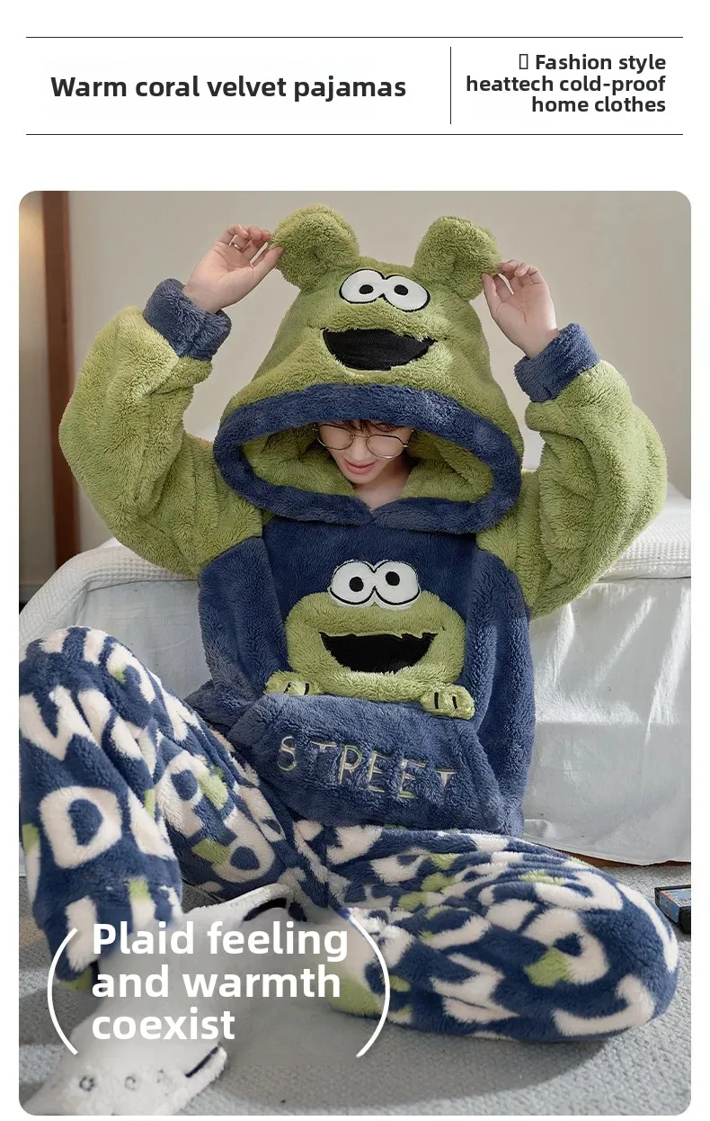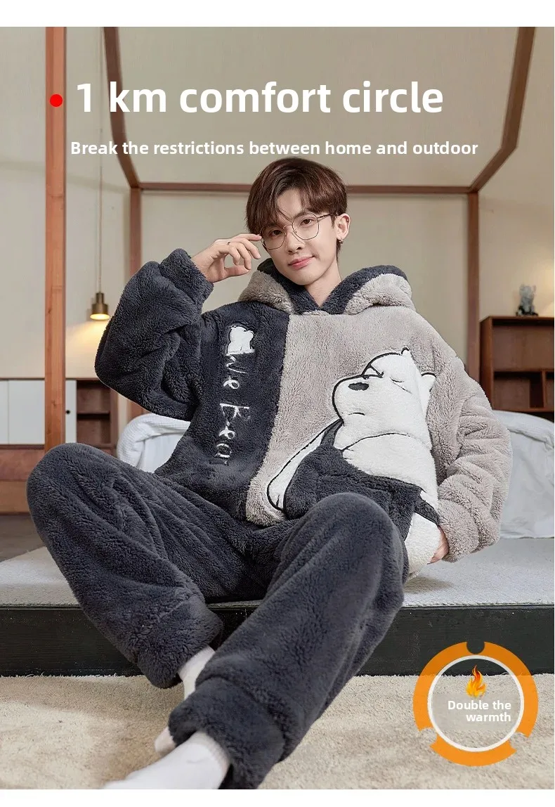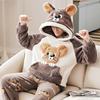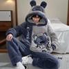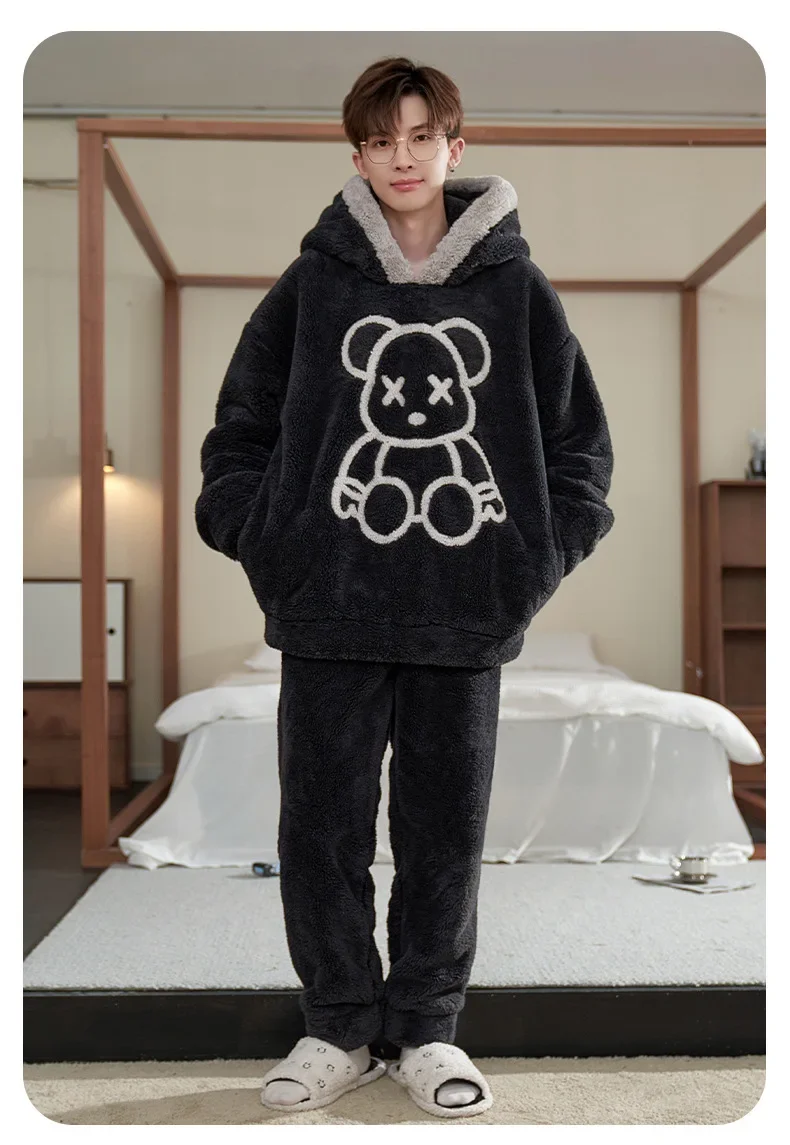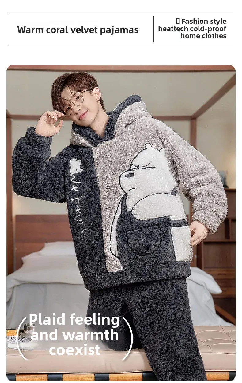 Ropa de dormir gruesa de lana Coral para hombre, conjunto de ropa para el hogar con capucha de dibujos animados, traje de ocio para el hogar juvenil, pijamas cálidos y acogedores para invierno