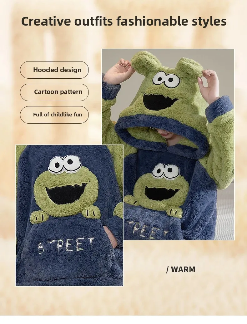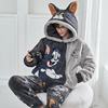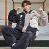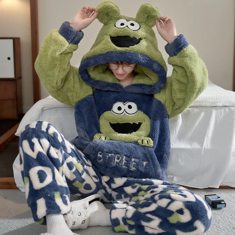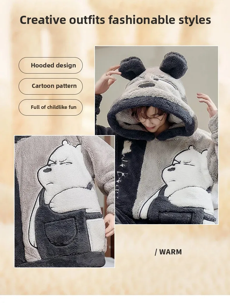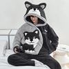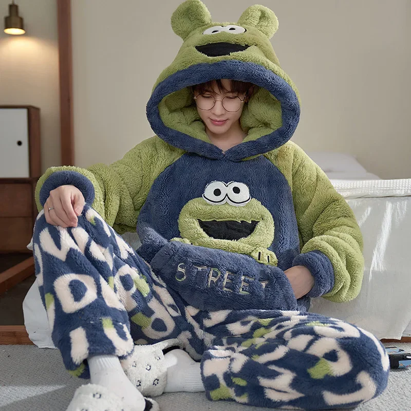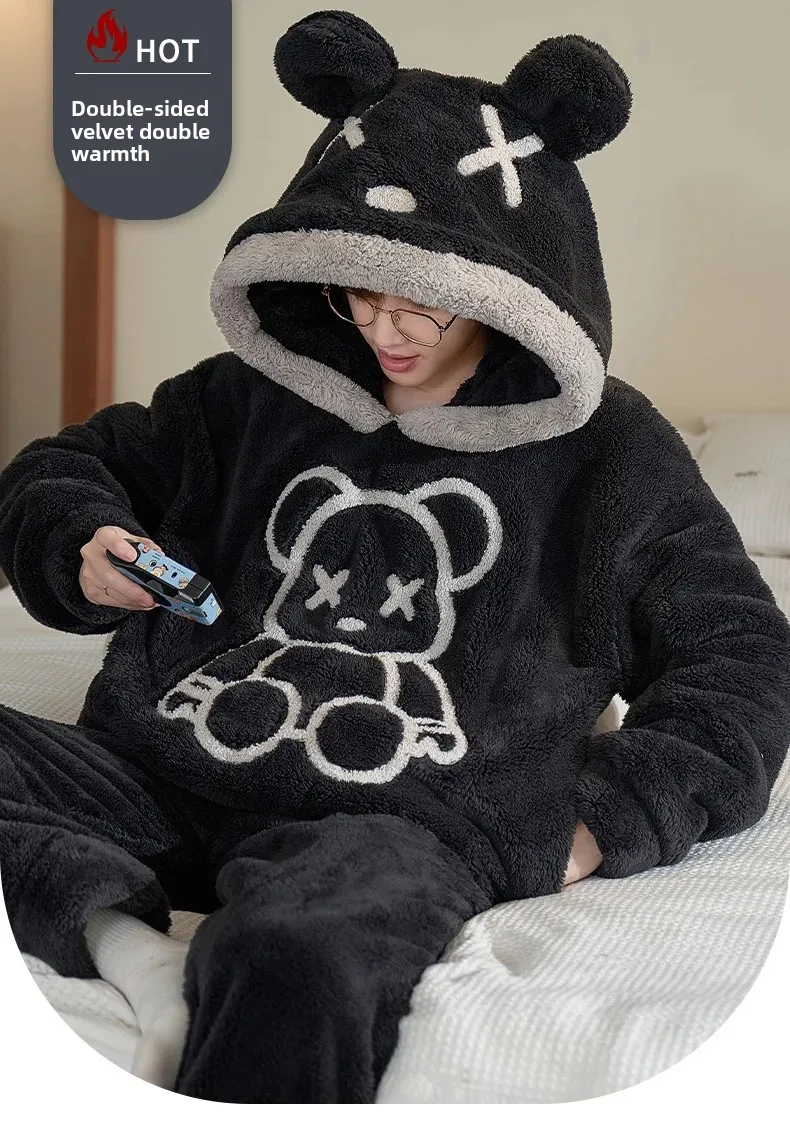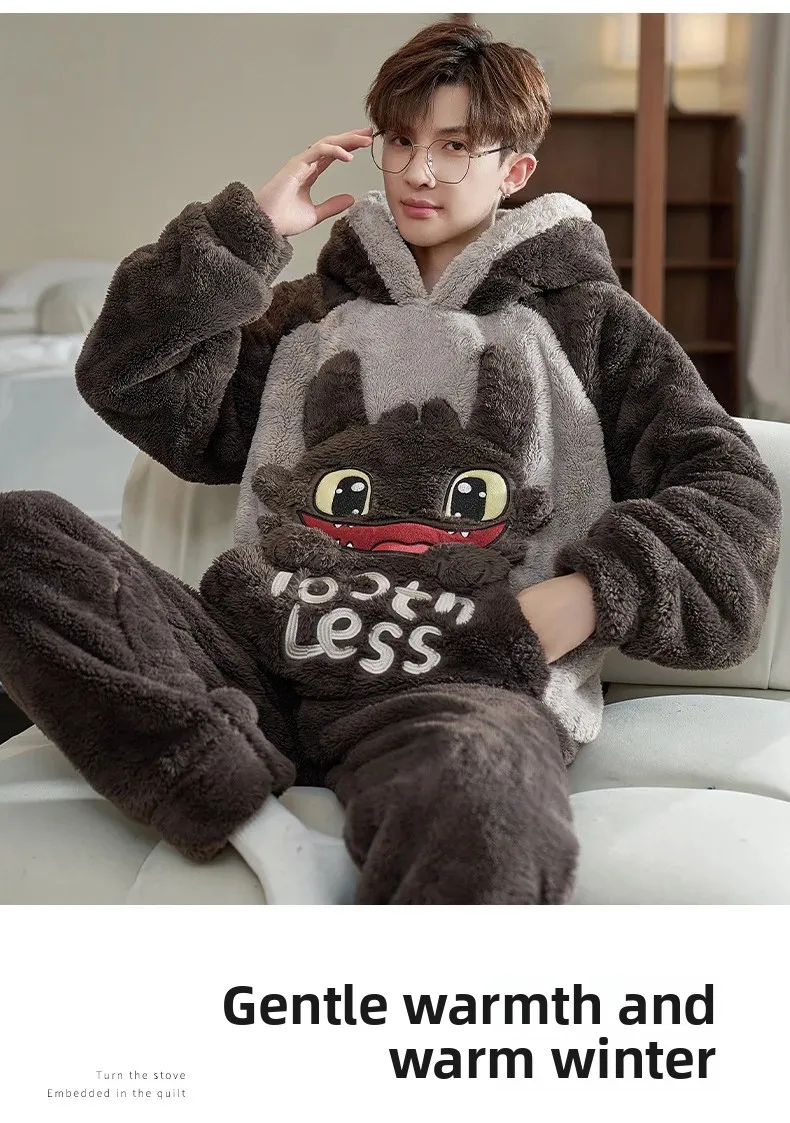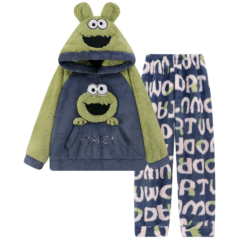 Ropa de dormir gruesa de lana Coral para hombre, conjunto de ropa para el hogar con capucha de dibujos animados, traje de ocio para el hogar juvenil, pijamas cálidos y acogedores para invierno