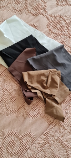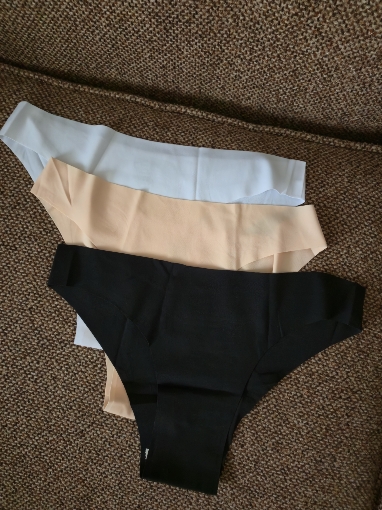 Bragas sin costuras. La tela en sí es agradable al tacto. La tela blanca sería más densa, mientras que las negras son significativamente diferentes (más gruesas). La talla L para una cadera de 100 cm es demasiado grande, pero son bajas y me da miedo que la M sea pequeña... Ligeras al cuerpo.